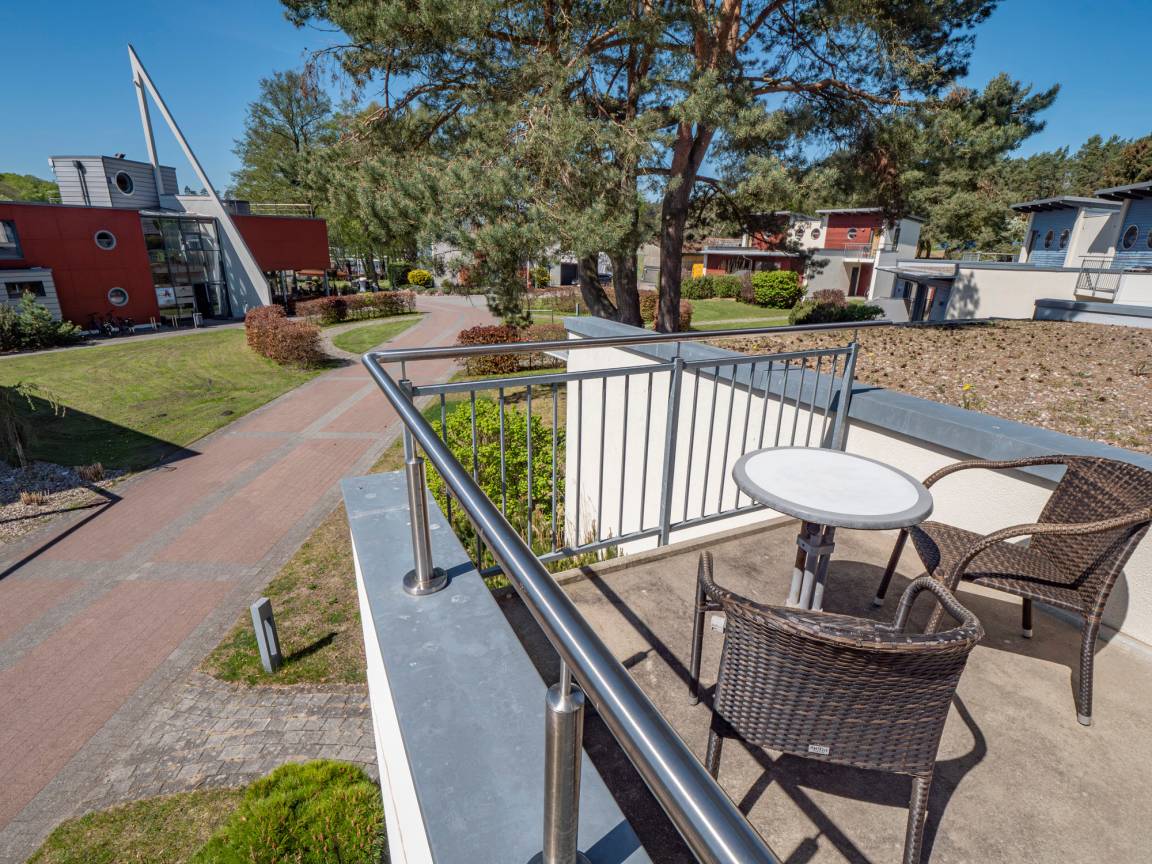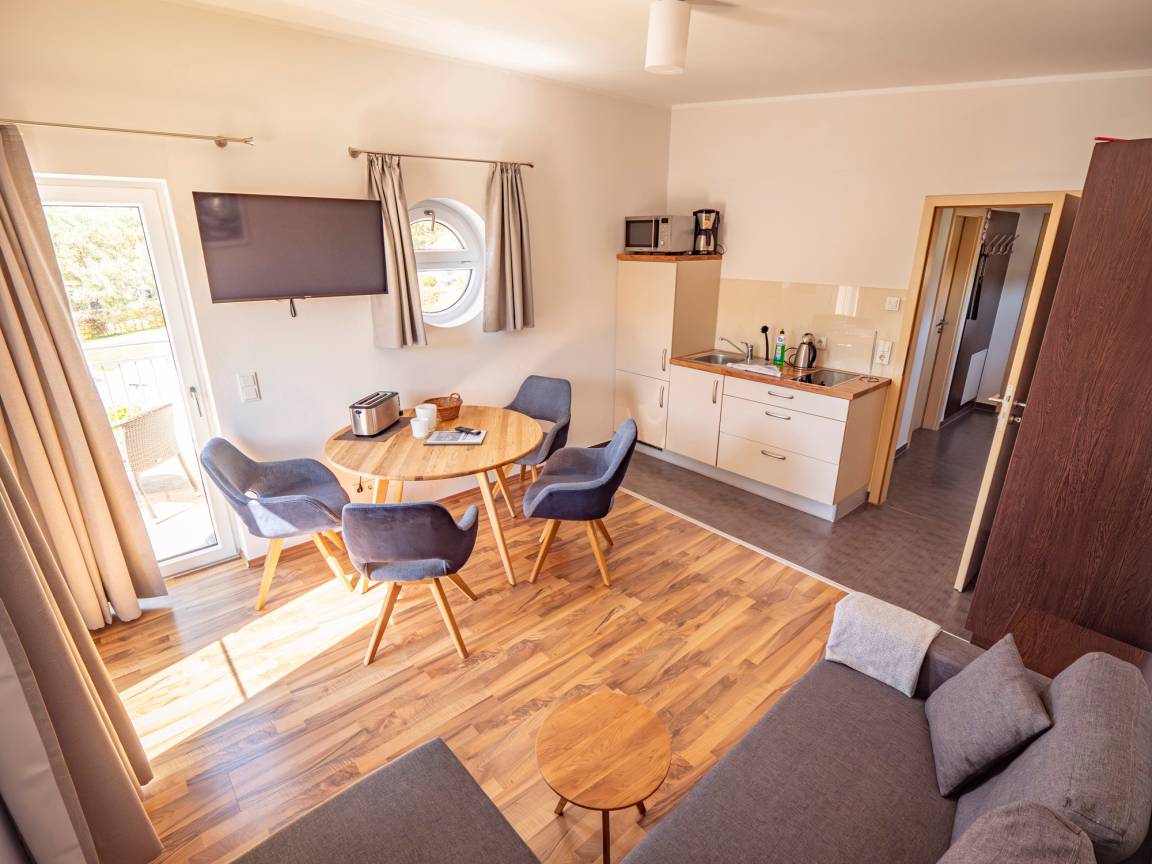 Unsere Ferienwohnung Kölpinsee im 1. OG bietet viel Platz für einen entspannten Urlaub. Sie sind ideal für zwei Personen geeignet. Im Wohnzimmer befindet sich eine Küchenzeile. Der Balkon vor dem Wohnzimmer gewährt den Ausblick über unsere Anlage.