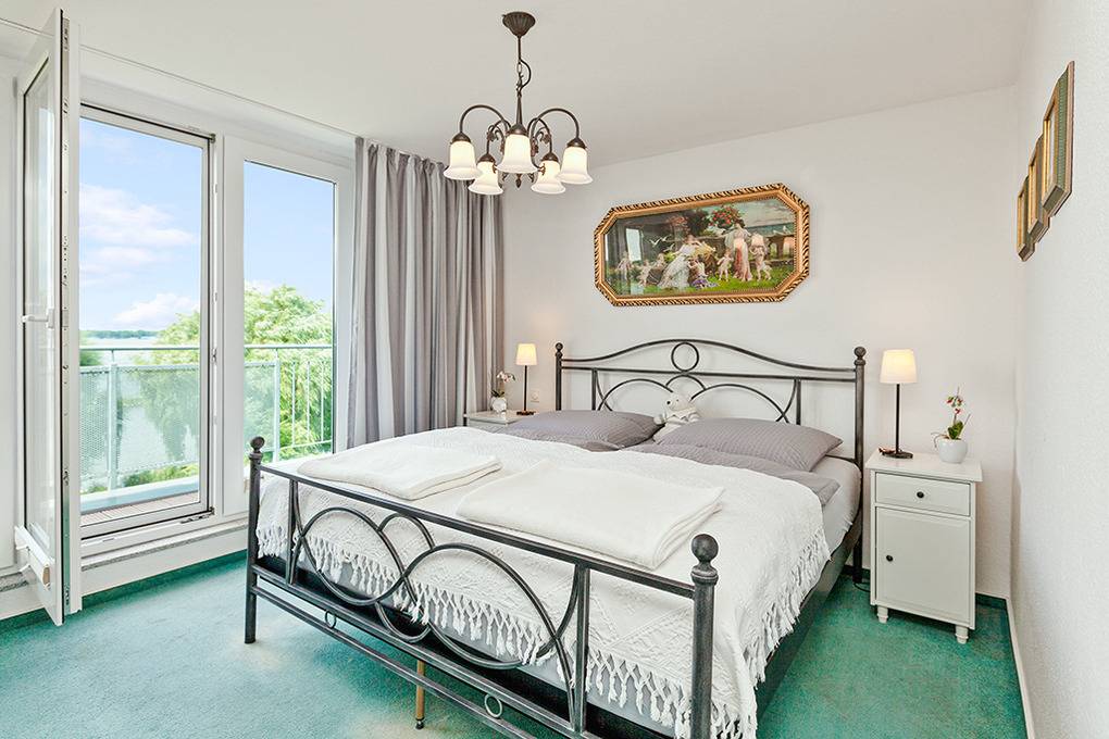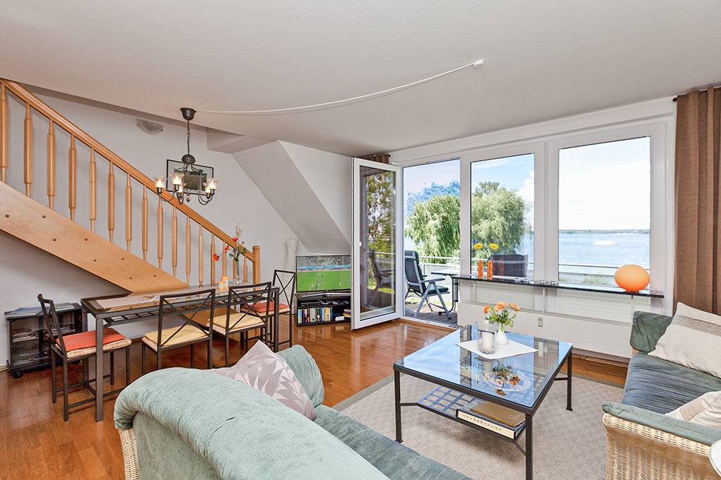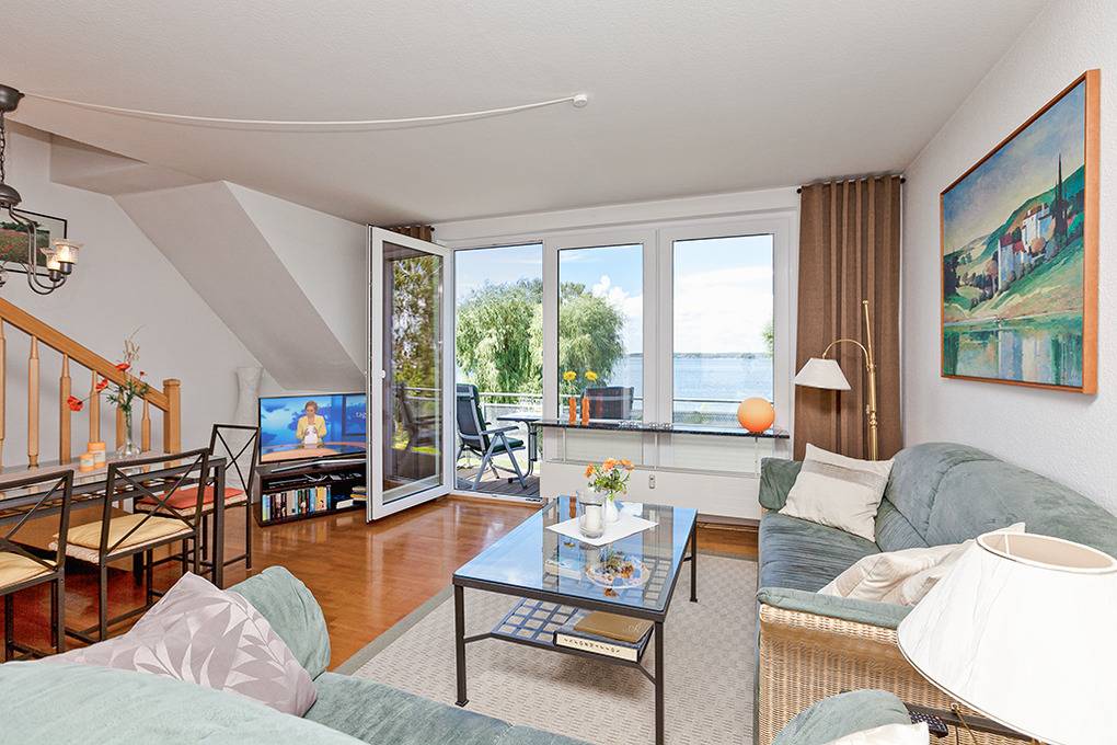 D 46.8 Wohnung 1-4 Pers.: 3-Zimmer-Maisonettewohnung mit 75 qm Wohnfläche über 2 Etagen. 2. Etage: Wohn-/Essraum mit Panoramafenstern, gemütlicher Sitzgruppe, Smart-TV, Radio/CD, Esstisch, offenem Küchenbereich (Backofen, Mikrowelle, Spülmaschine, Küchentresen, Barhocker), Balkon mit schönem Seeblick auf die Müritz. 2-Bettzimmer mit TV. Vom Wohnraum aus Treppe in die 3. Etage: Schönes Doppelzimmer mit TV, Balkon. Großes Bad: Bw, Du, Wb, WC, Haarfön.