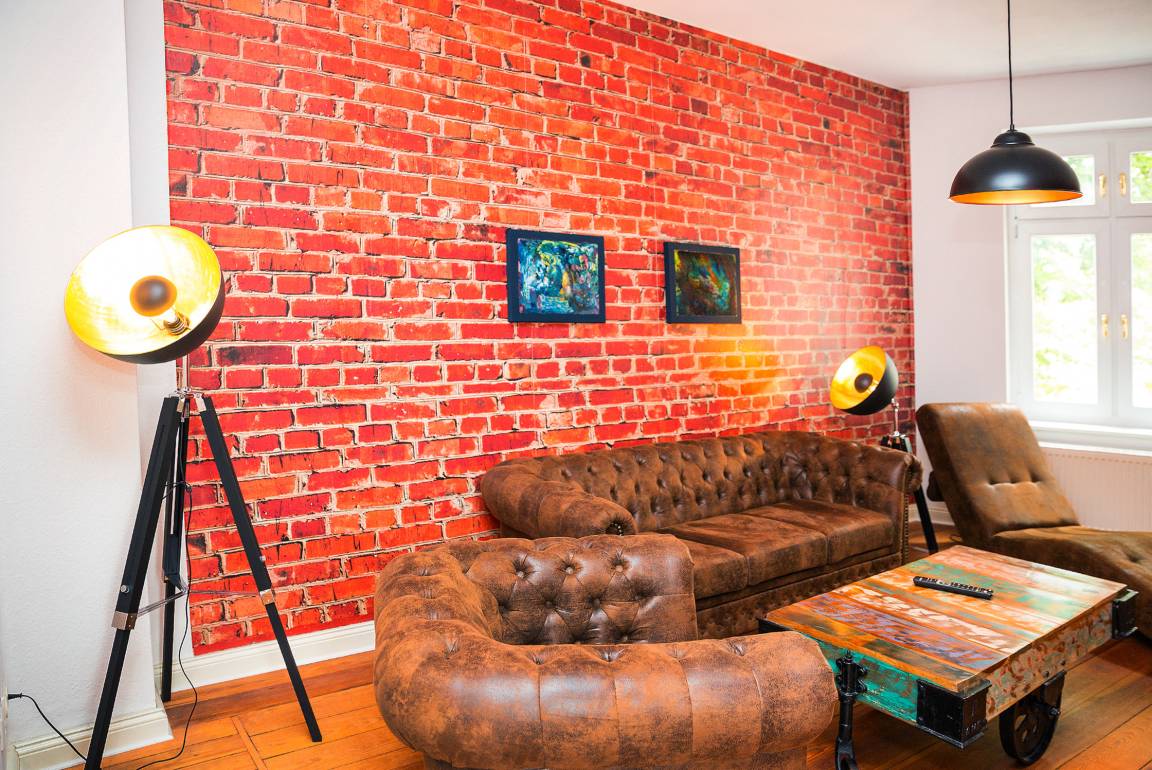 Das anliegende Schlafzimmer bietet einen direkten Zugang zum Balkon. Selbst hier ist die Linie des Einrichters zu erkennen und trotzdem ist mit dem Boxspringbett (180x200) für erholsamen Schalf gesorgt worden. Das Highlight setzt der Schrank bzw. die Nachttischschränke die mit einem Materialmix aus Eisen und Altholz an ein Designloft erinnern. Perfekt darauf abgestimmt sind auch die dazugehörigen Nachttischlampen, die an Beleuchtungen eines Filmsets erinnern.