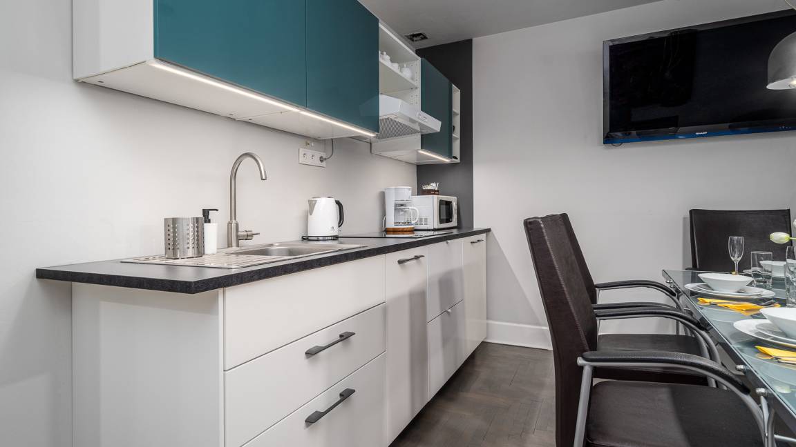 • Haustiere sind in der ausgewählten Wohnung erlaubt. Die Kosten für den Aufenthalt mit einem Haustier betragen 40 PLN pro Tag.
