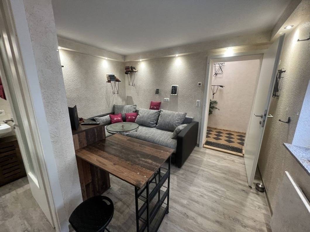 Auf ca. 23 qm bieten wir für Euch eine moderne Unterkunft mit vielen Kleinigkeiten, die das Herz erfreuen. Im Wohn- Schlafraum befindet sich eine Schlafcouch, ein Fernseher, die Küchenzeile und ein kleiner Essbereich.
