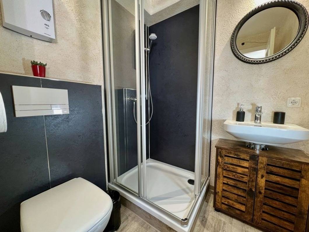Für den täglichen Bedarf ist die Küchenzeile mit Geschirr, Besteck, Kaffeemaschine, Toaster, Wasserkocher, Mikrowelle und Kühlschrank mit Tiefkühlfach eingerichtet. Angrenzend an den Wohn- Schlafraum befindet sich das moderne Bad mit WC und einer geräumigen Dusche. Um all unseren Gästen den besten Preis bieten zu können, ist das Wäschepaket bei uns nicht in der Grundausstattung enthalten, sondern kann optional (5,-€/ Person) zugebucht werden.