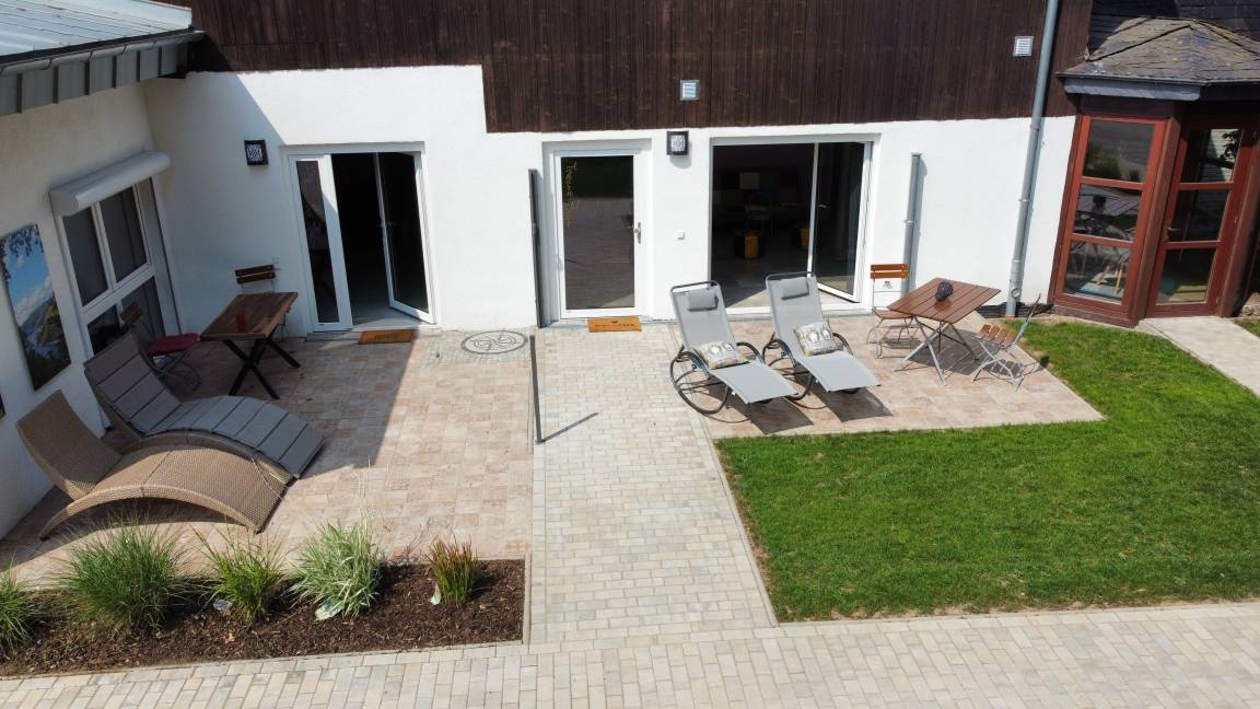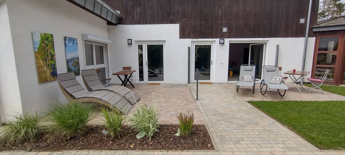Ein eigener Terrassenbereich oder die gemeinsame Sitzgruppe im Garten unter Bäumen mit Blick auf den Rhein wartet auf Sie.