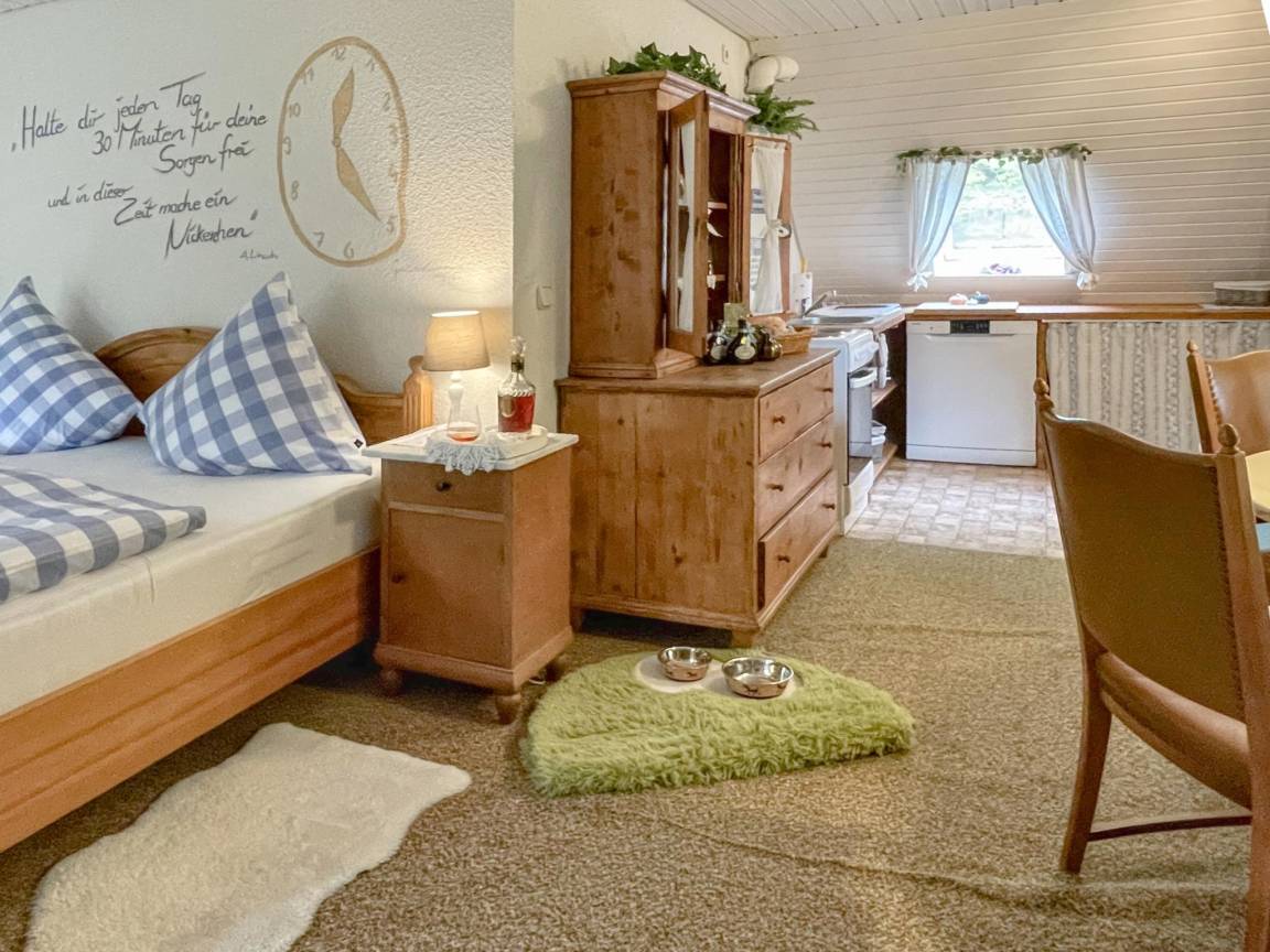 Gästeunterkunft in der 1. Etage: Eingang, offene Küche mit Wasserkocher, Toaster, Kochherd(2 Kochplatten, elektrisch), Kaffeemaschine(Filter), Kühlschrank(+ Gefrierfach) , Wohn-/Schlafzimmer mit Doppelbett(140 x 200 cm), TV(Flatscreen, Satellit), Dekokamin, Radio, Fliegengitter , Badezimmer mit Badewanne mit Dusche, Waschbecken, Toilette, Föhn