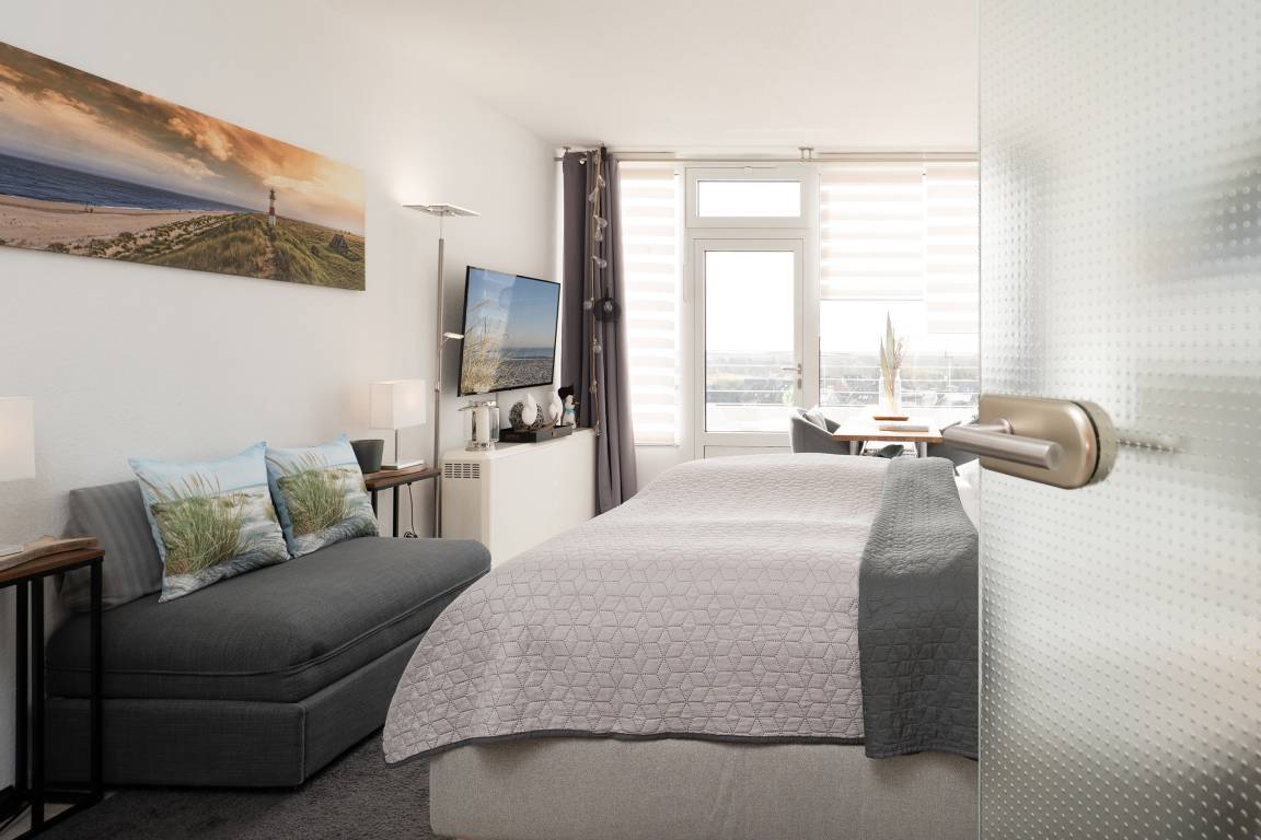 Verbringen Sie entspannte Urlaubsstunden im Wohnzimmer, das über Zugang zu dem Süd-Balkon verfügt, wo Sie in angenehmer Runde einen Sundowner genießen können. Das Schlafsofa im Wohnzimmer dient als Schlafplatz für einen Gast. Die weiteren Urlaubsbegleiter finden Ihre Ruhe im angrenzenden Schlafzimmer, das mit einem 180cm breitem Bett zum Ausschlafen einlädt. Die Frische für den Tag holen Sie sich morgen im praktisch eingerichteten Badezimmer mit Dusche und Haartrockner. Die Küche ist gut ausgestattet und bietet mit Toaster und Kaffeemaschine die wichtigsten Basics für ein schnelles Frühstück um gestärkt in den Tag zu starten.