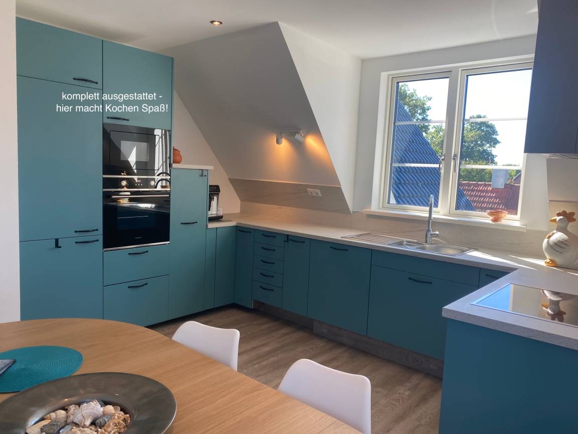 Schmuckstück bis 8 Personen mit Familienbett: 3 Schlafräume, 2 Bäder mit Fenster, Bollerofen, kleiner und großer Balkon mit Elektrogrill. Lichtdurchflutet, gepflegt und gemütlich, WLAN (HighSpeedInternet), Fahrradunterstand, 1 Parkplatz, max. 3 Hunde. Strandentfernung ca. 1,5 und 2,5 km.