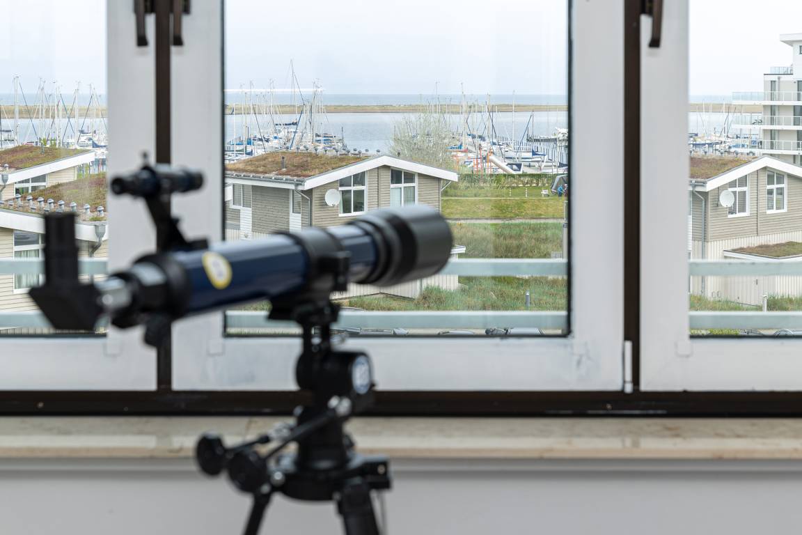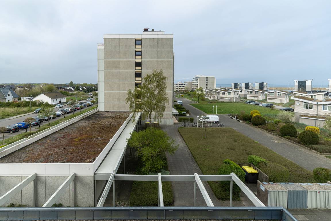 Der 4. Stock, in welchem sich die Wohnung befindet, erreichen Sie über das Treppenhaus oder aber bequem über den Fahrstuhl, der direkt gegenüber von der Wohnung hält. Wer noch höher hinaus möchte, kann über das per Hausflur verbundene Nachbarhaus Palstek 2a auf die Dachterrasse für einen grandiosen Rundumblick über die Marina, den Beginn der Kieler Förde und die Probstei genießen.
