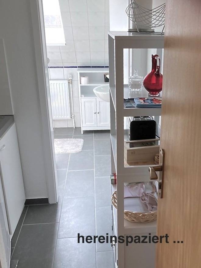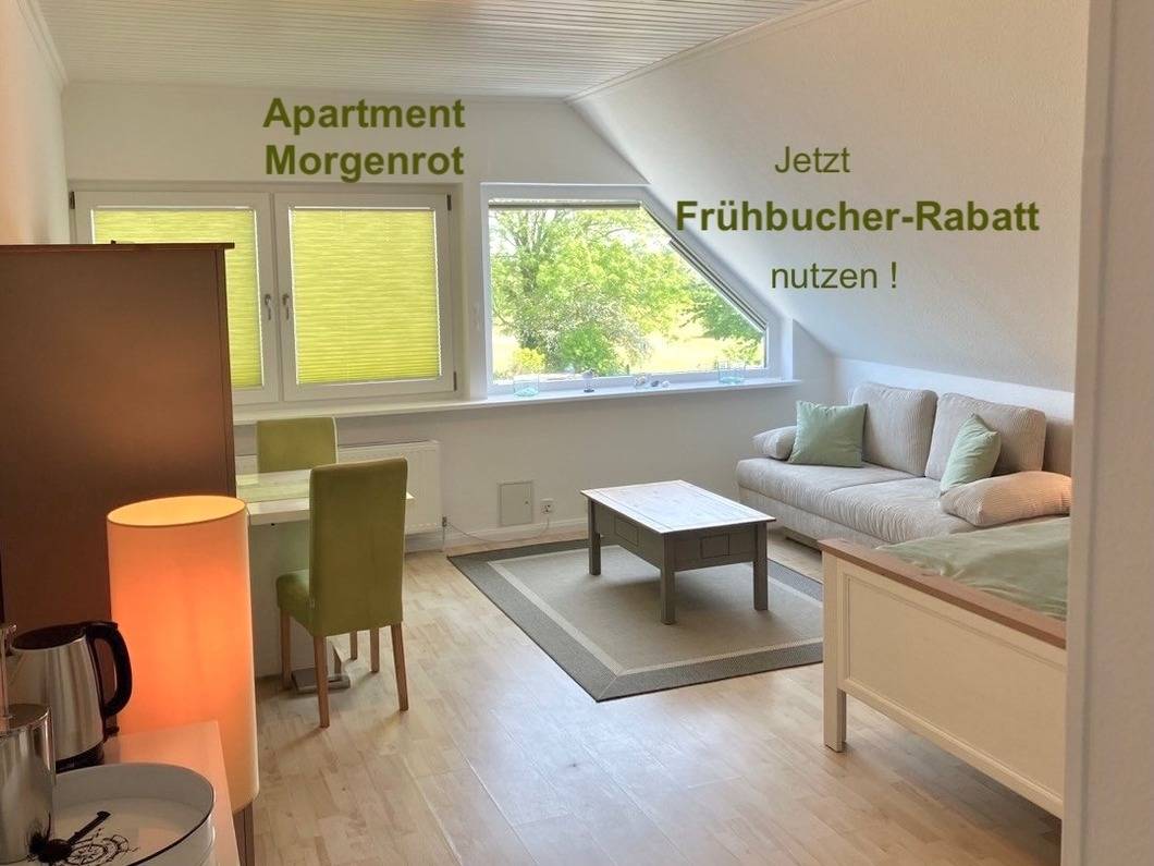 Dieses kuschelige 1-Raum-Apartment "Morgenrot" im 1. OG eines alleinstehenden Hauses (Zugang ohne Fahrstuhl) ist hell und gemütlich möbliert. Es hat einen kombinierten Wohn-/Schlafraum und verfügt über eine gut ausgestattete Küchenzeile mit ausreichend Geschirr, Kühlschrank/Gefrierfach, Geschirrspüler, Kaffeemaschine, Wasserkocher und Toaster. Ihren Kaffee können Sie hier auch in einem Bodum Kaffeemaker zubereiten und für Ihre Mahlzeiten steht ein 2 Flammen-Ceranfeld bereit.