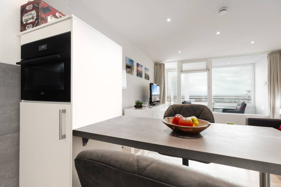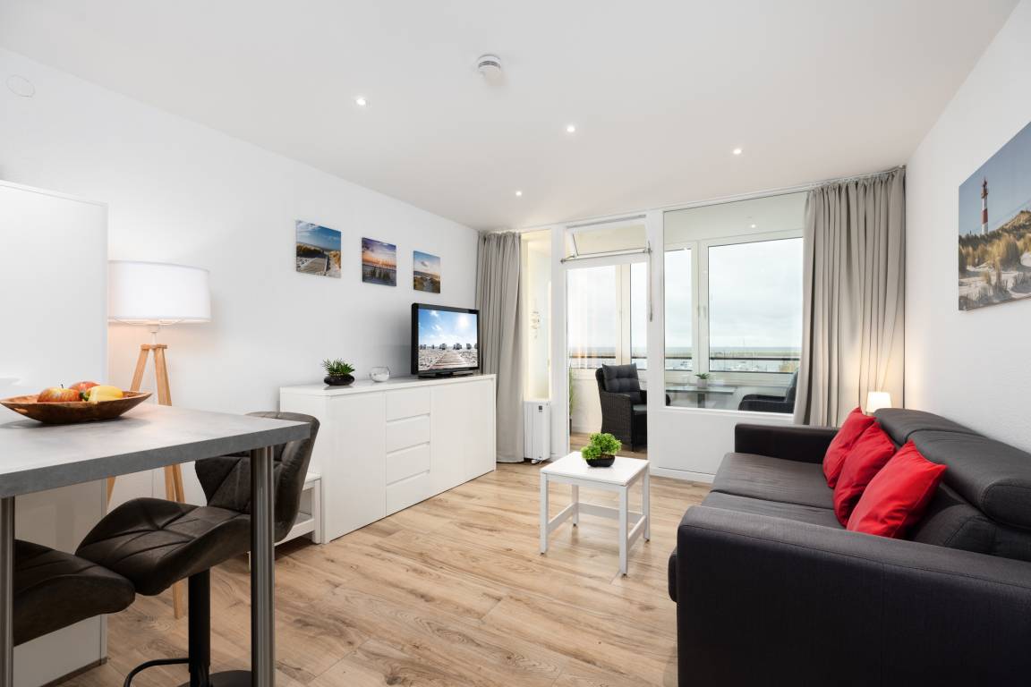 Die 1-Zimmer-Ferienwohnung Leuchtturmblick mit ca. 33 m² Wohnfläche im 5. Stock ist für 2 Personen geeignet.