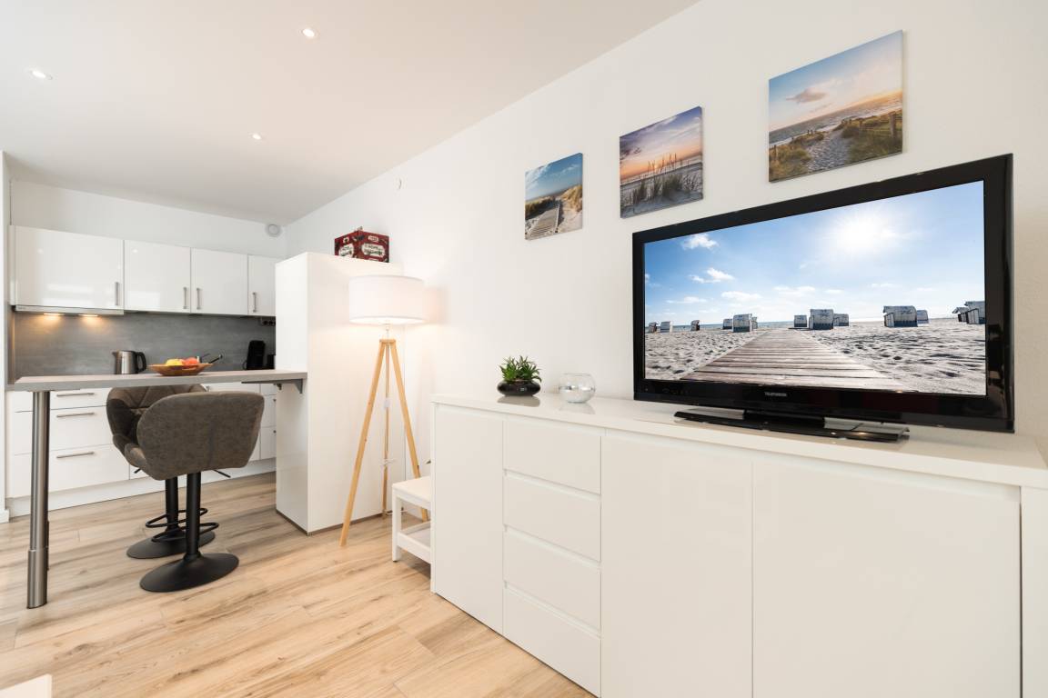 Die Wohnung ist modern ausgestattet, die offene Wohnküche bietet alles was das Herz begehrt - Induktionsherd, Toaster, Kaffee- und Espressomaschine, Spülmaschine sowie eine Mikrowelle mit Backofen-Funktion. Zur Nacht wird die Couch einfach zum gemütlichen Bett ausgeklappt. Wunderbar - der Ausblick direkt auf den Yachthafen. Im geschlossen Balkon kann man den Abend gemütlich ausklingen lassen.