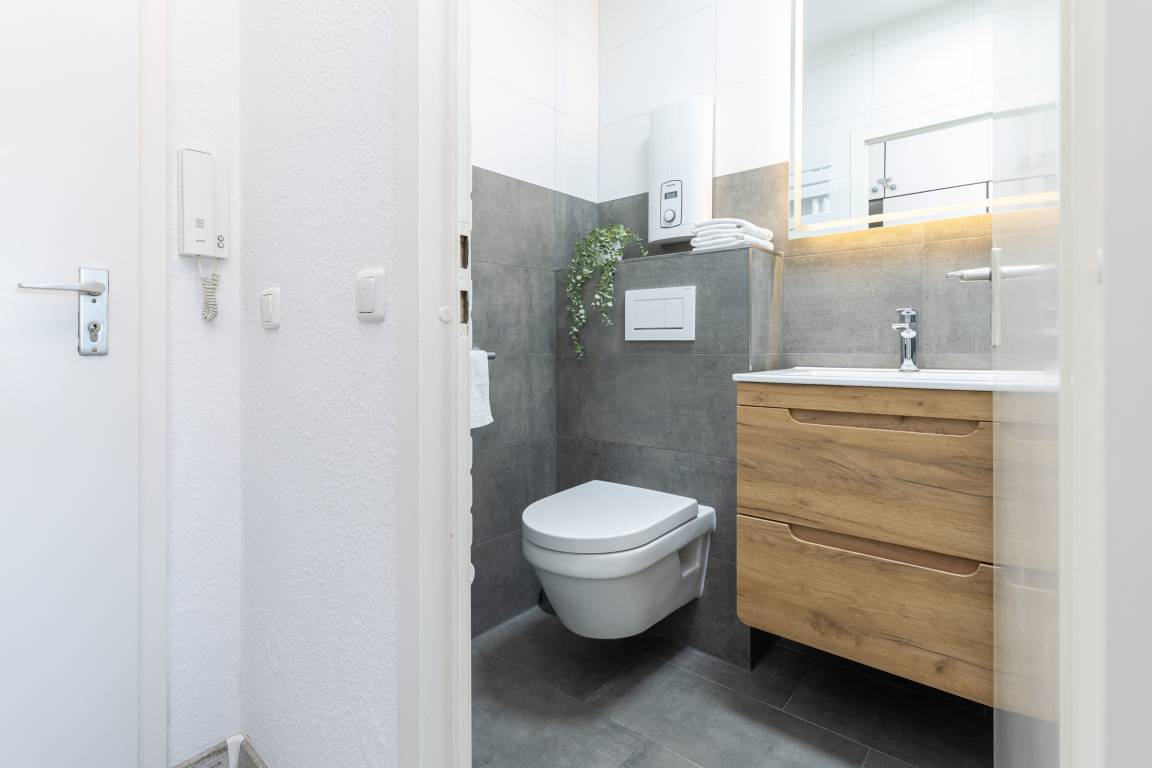 Die offene Küche ist vollständig ausgestattet und lädt dazu ein, leckere Mahlzeiten selbst zuzubereiten. Das moderne Duschbad rundet das Wohlfühlangebot ab und sorgt für einen erfrischenden Start in den Urlaubstag.