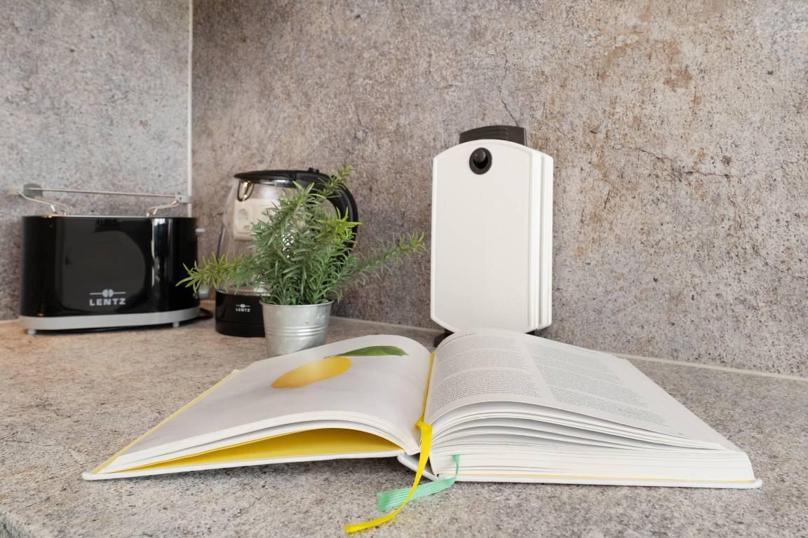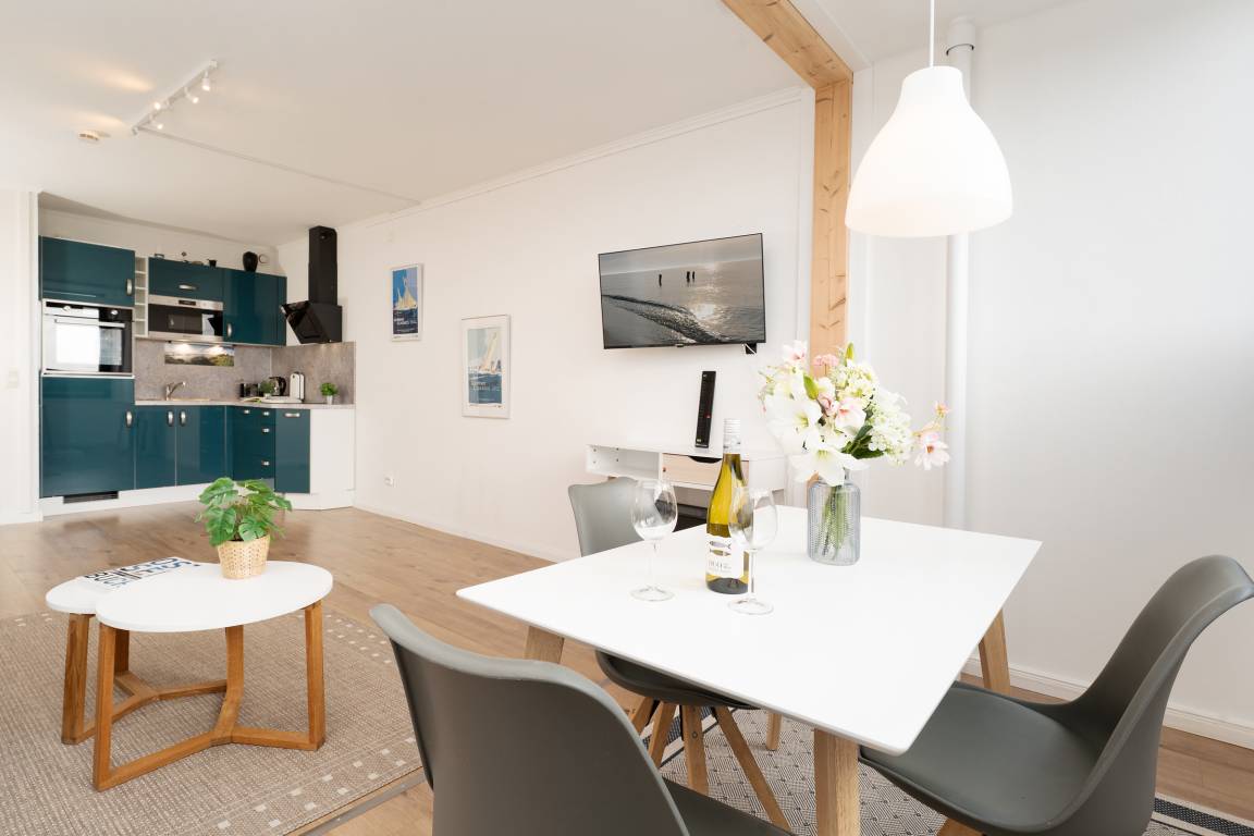 Die offene Küche ist gut ausgestattet und bietet alles, was Sie für die Zubereitung Ihrer Mahlzeiten benötigen. Zur Ausstattung gehören unter anderem ein Cerankochfeld, Kühlschrank mit Gefrierfach, Mikrowelle, Geschirrspüler, Kaffeemaschine, Wasserkocher und Toaster. Ein Essplatz lädt dazu ein, gemeinsam zu speisen und den Urlaubstag gemütlich ausklingen zu lassen.