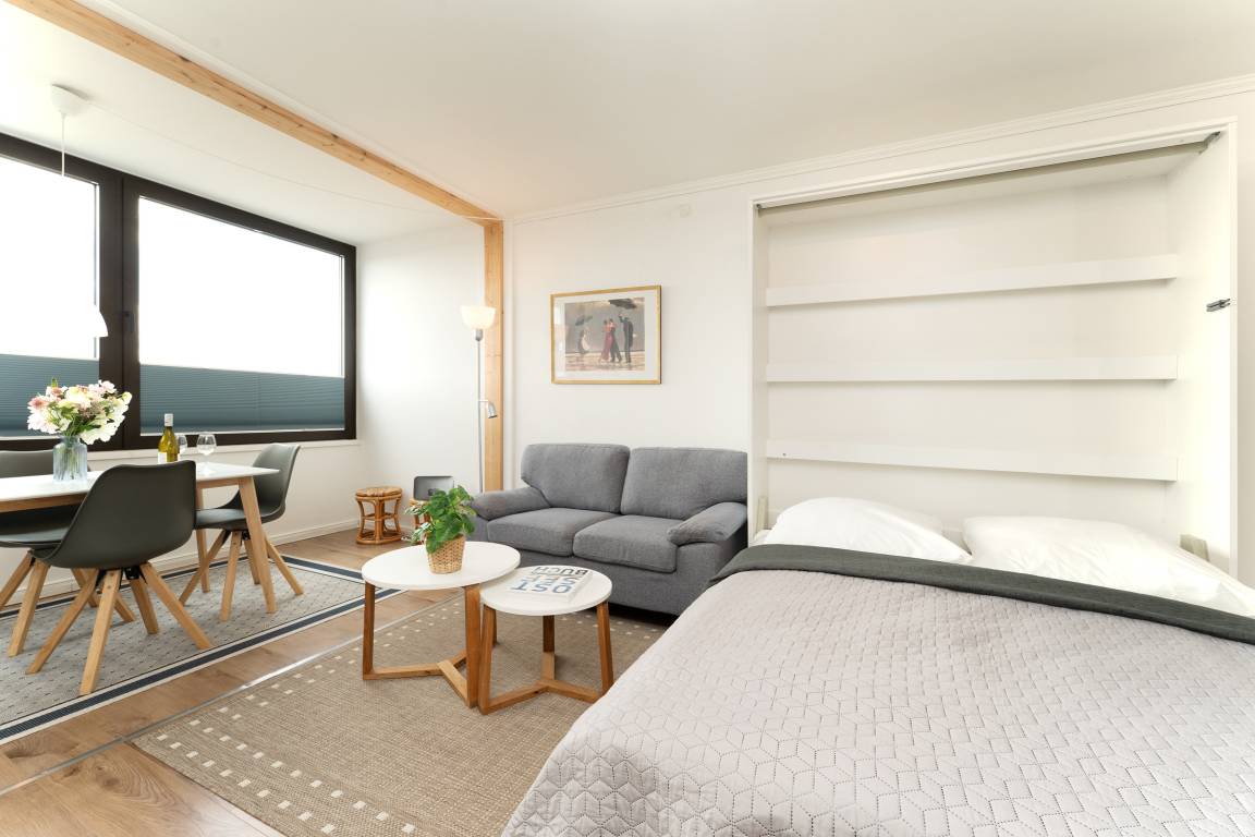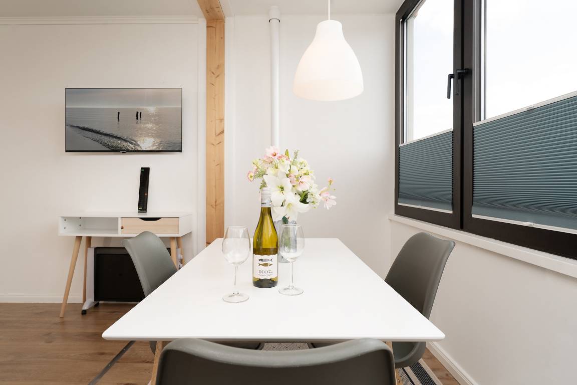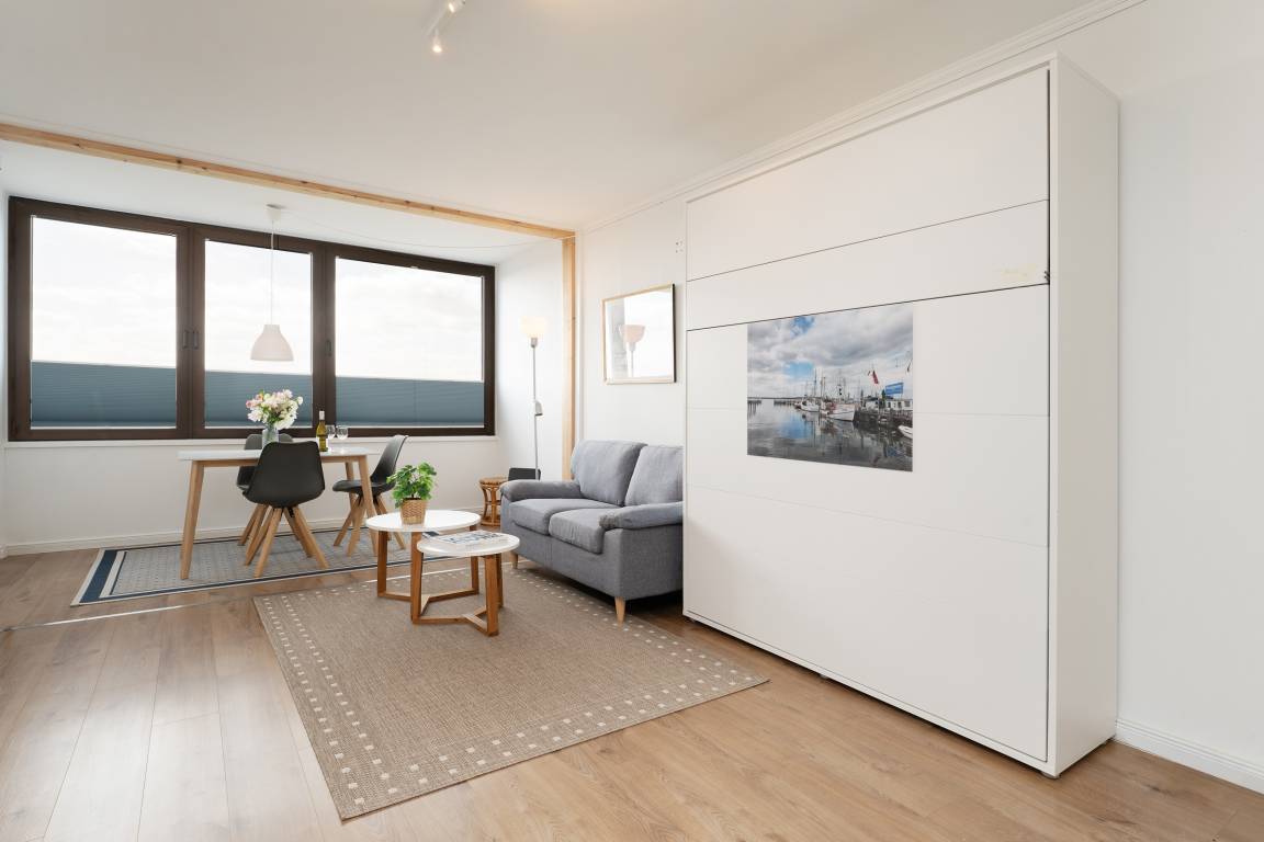 Beim Betreten der Wohnung gelangen Sie direkt in den hellen Wohn- und Schlafbereich, der mit einem komfortablen Doppelbett ausgestattet ist und eine gemütliche Atmosphäre für einen erholsamen Urlaub schafft. Ein Fernseher bietet Unterhaltung nach erlebnisreichen Urlaubstagen.