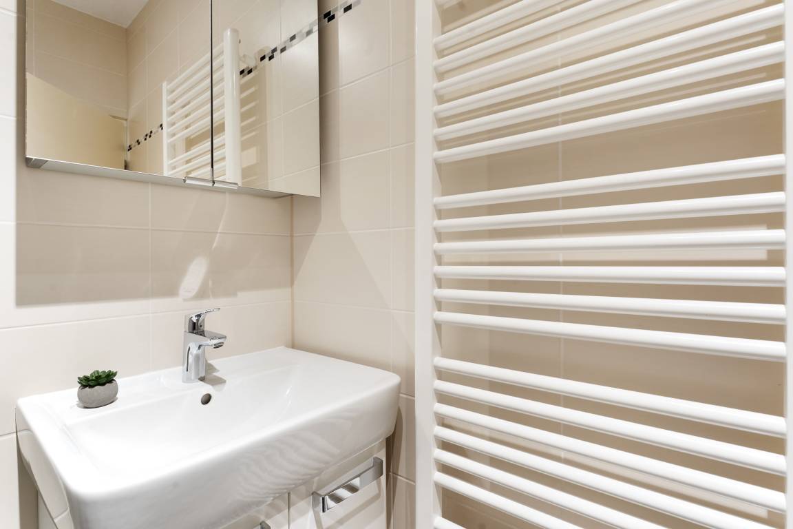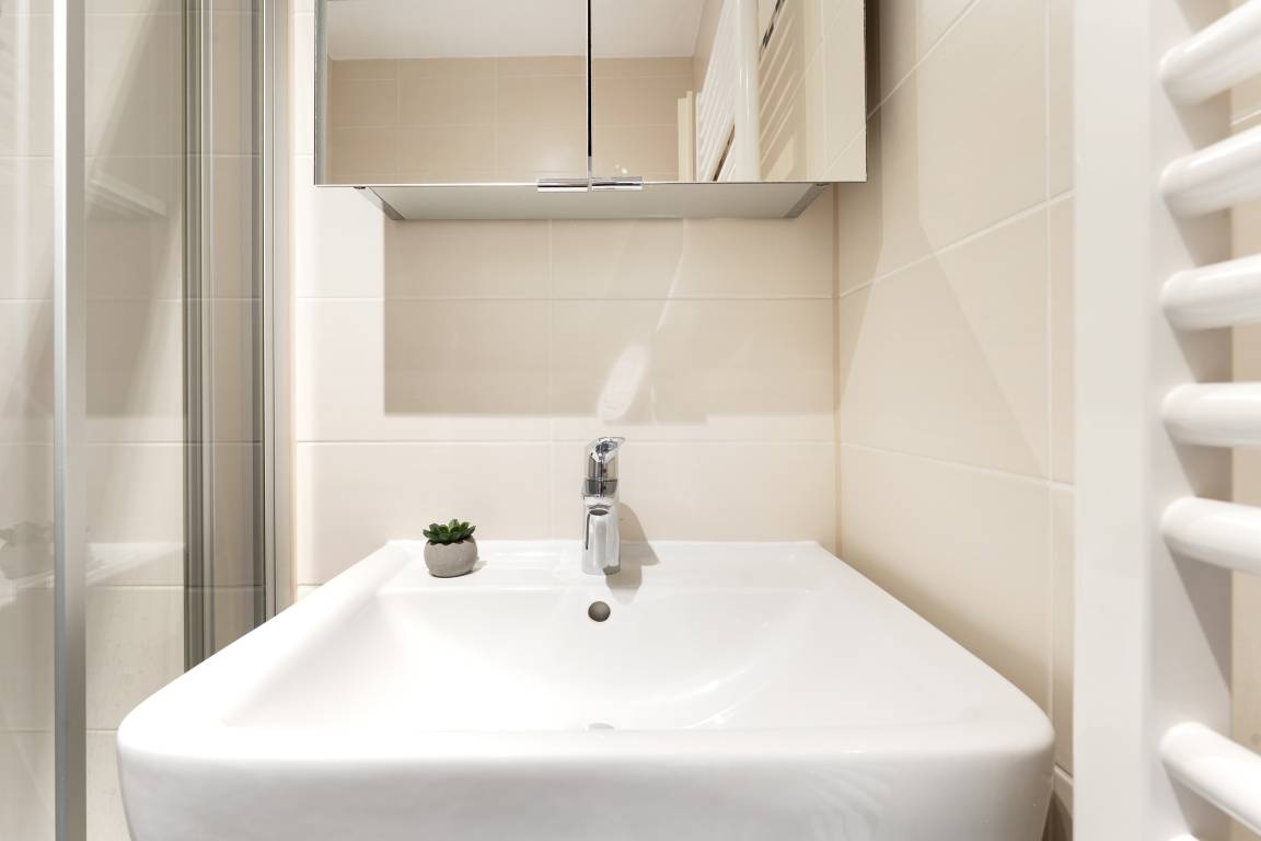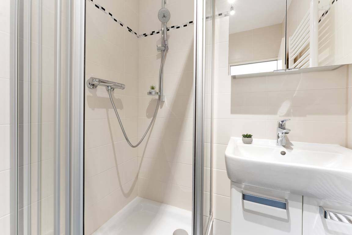 Das moderne Badezimmer verfügt über eine Dusche, ein WC sowie ein Waschbecken.