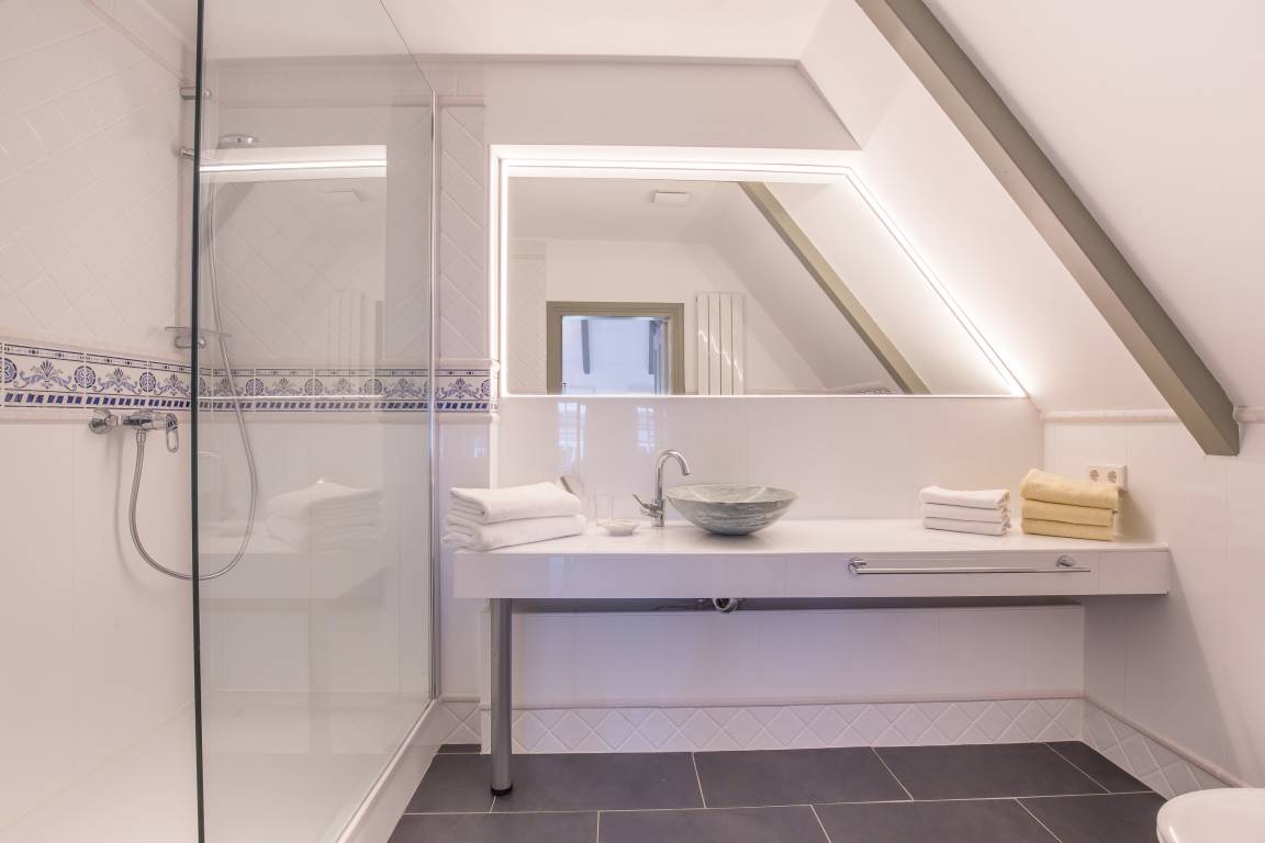 Dort befindet sich ihr Strandkorb mit Sonnenschirm und Bestuhlung. Vom Treppenhaus führt eine Treppe in das große im Dachgeschoss gelegene Schlafzimmer mit Doppelbett und einem Kinderzimmer. Dem Schlafzimmer angrenzend finden sie ein elegantes Bad mit großer Dusche und WC.