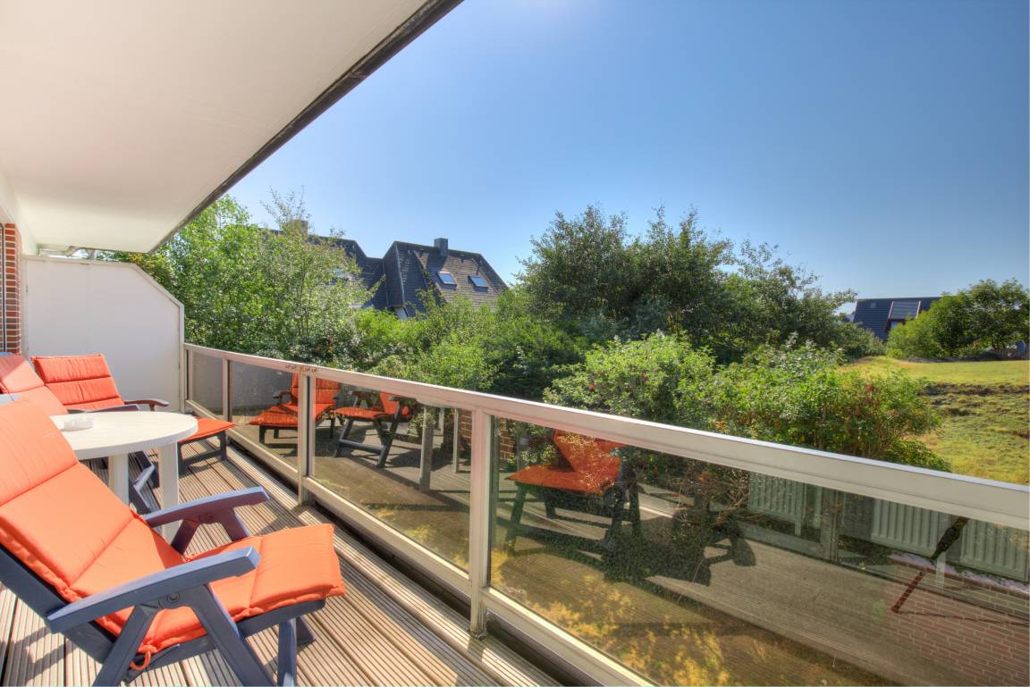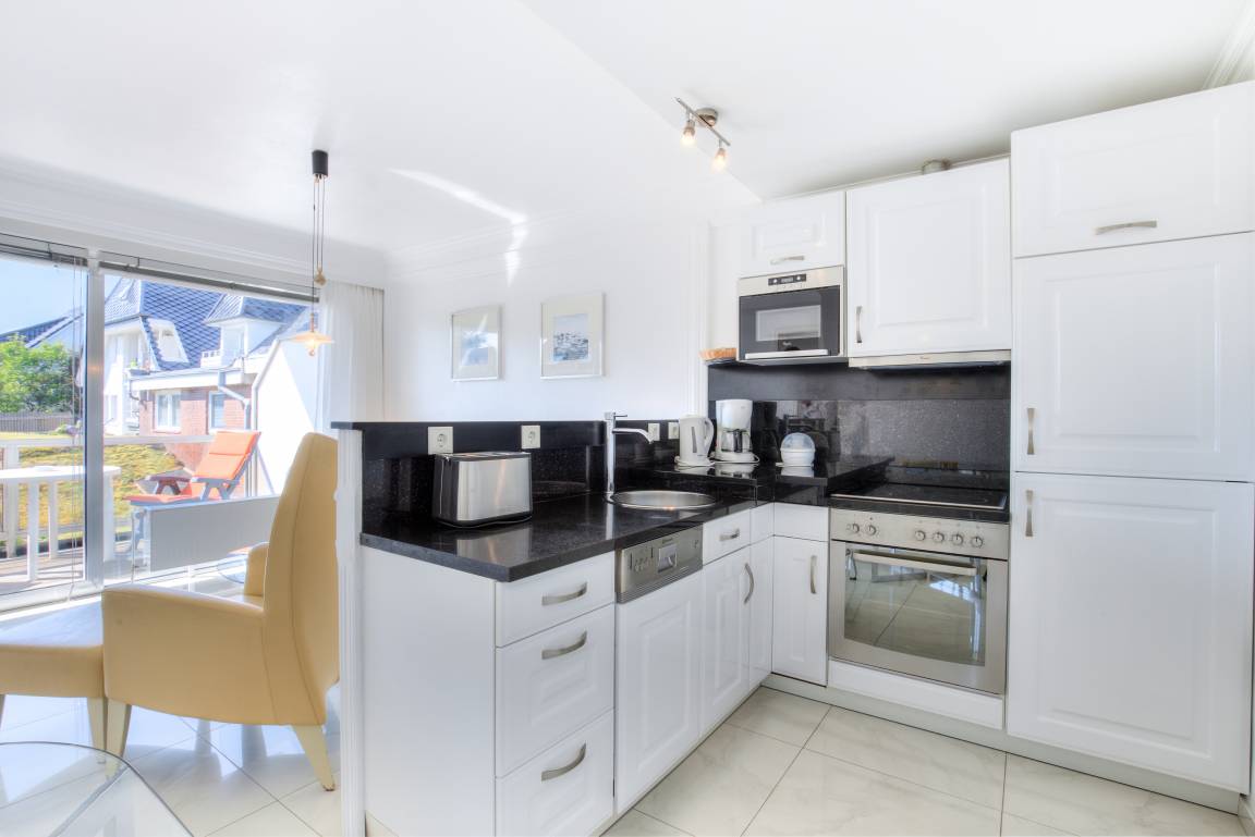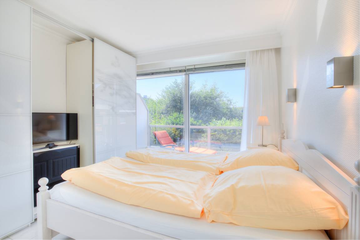 Lichtdurchflutete und strandnahe 45 m² 2-Zimmer-Ferienwohnung. Wohn- und Schlafzimmer mit Süd-/Westbalkon und Duschbad mit Whirlpool.