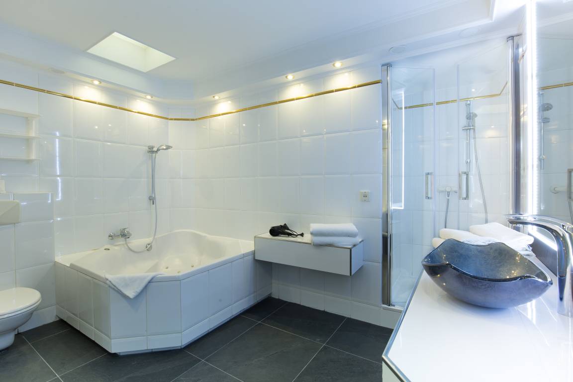 Im ersten geräumigen Bad stehen Ihnen eine Whirlpoolwanne und eine Dusche zur Verfügung.