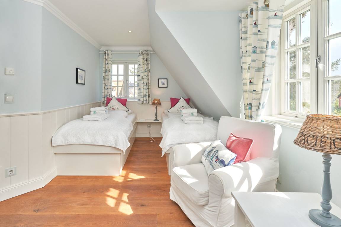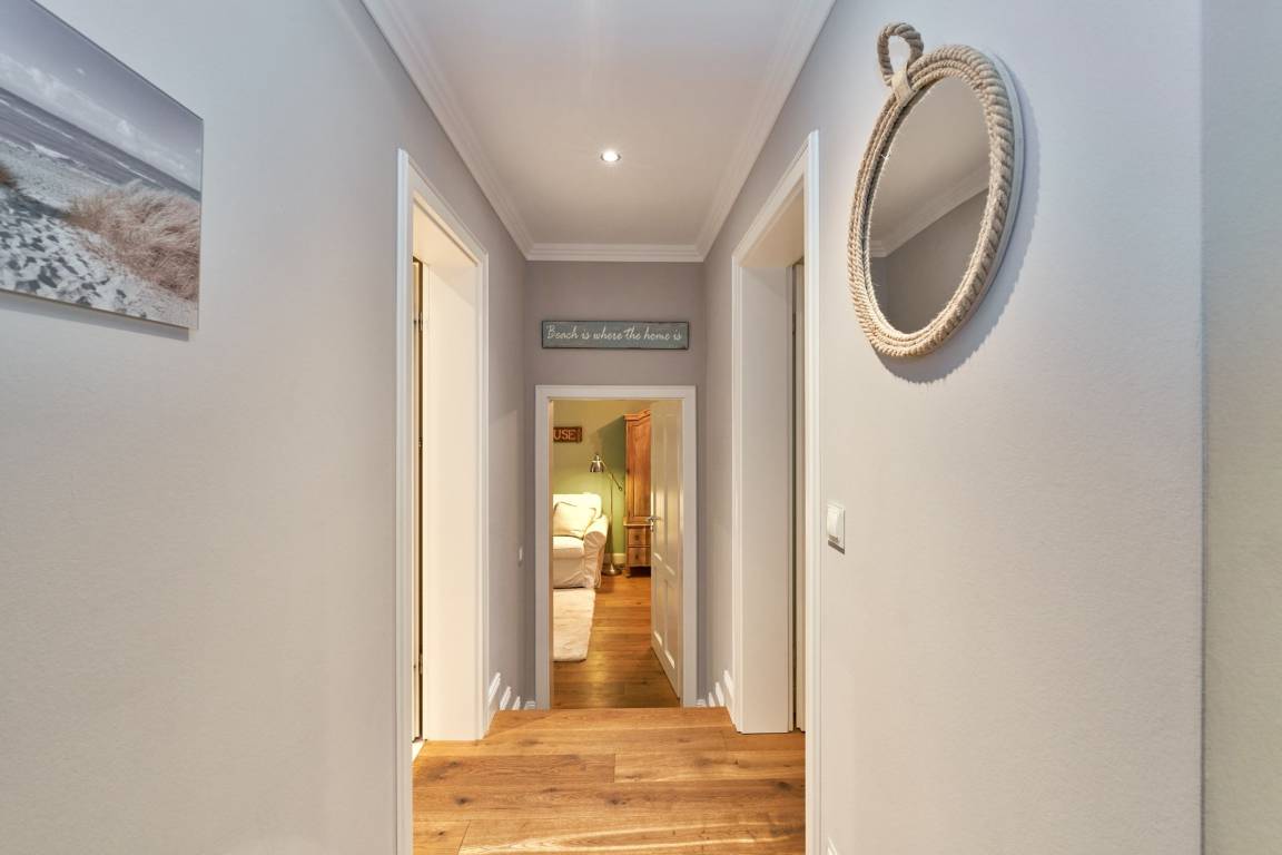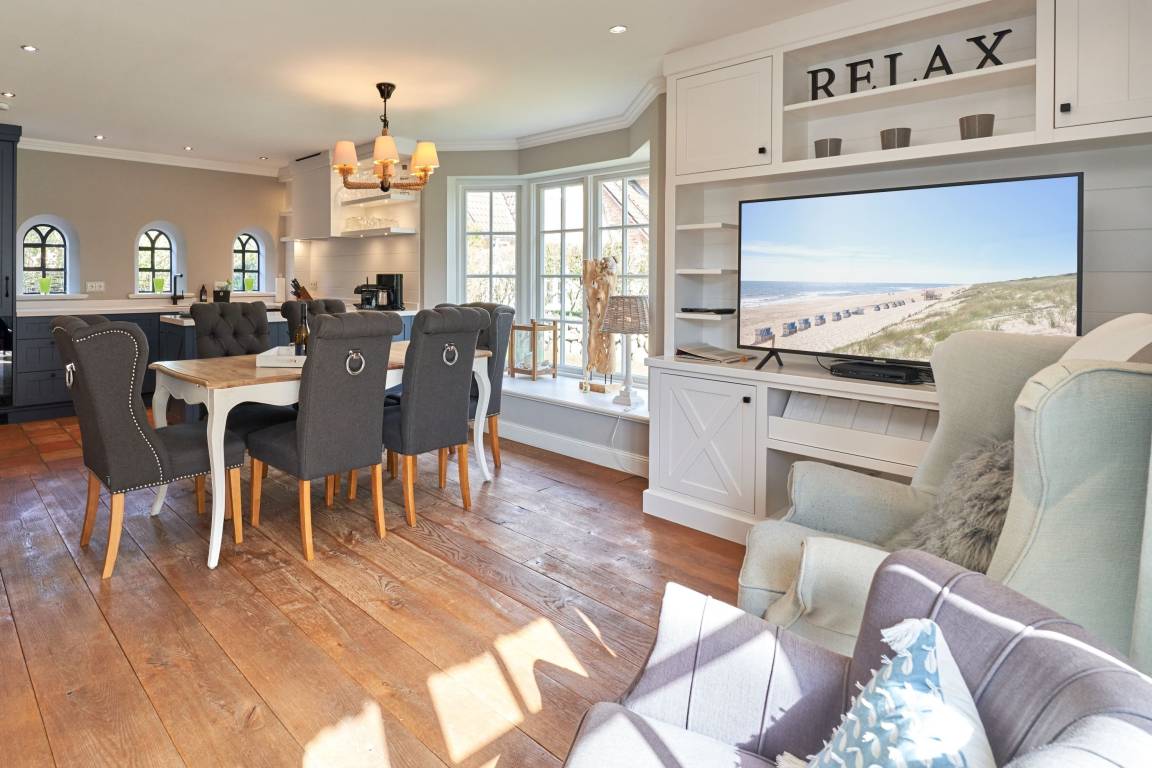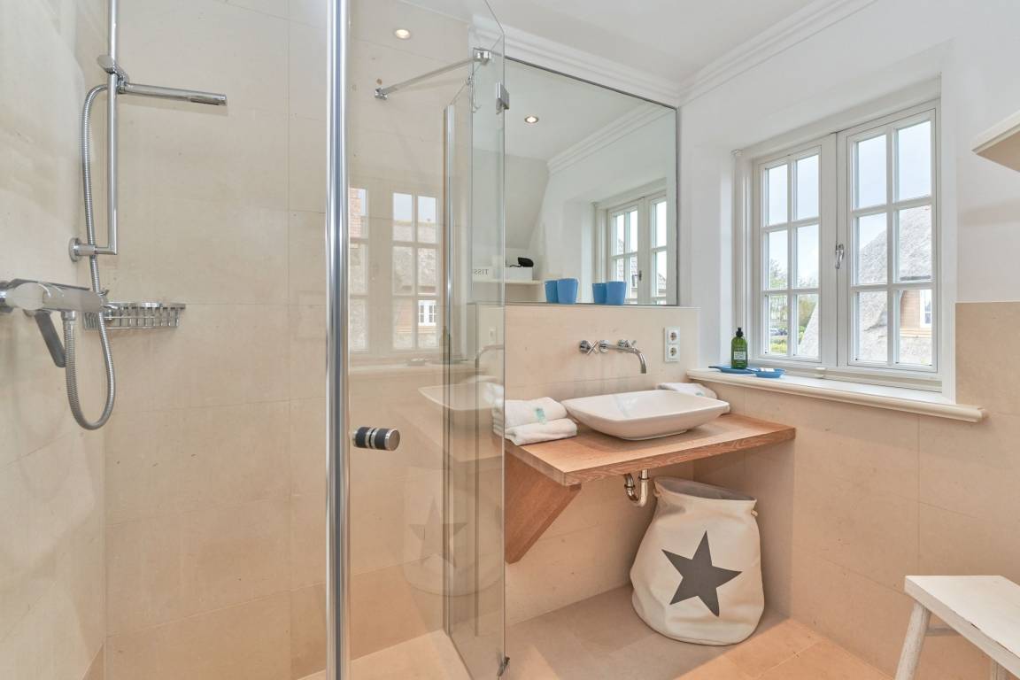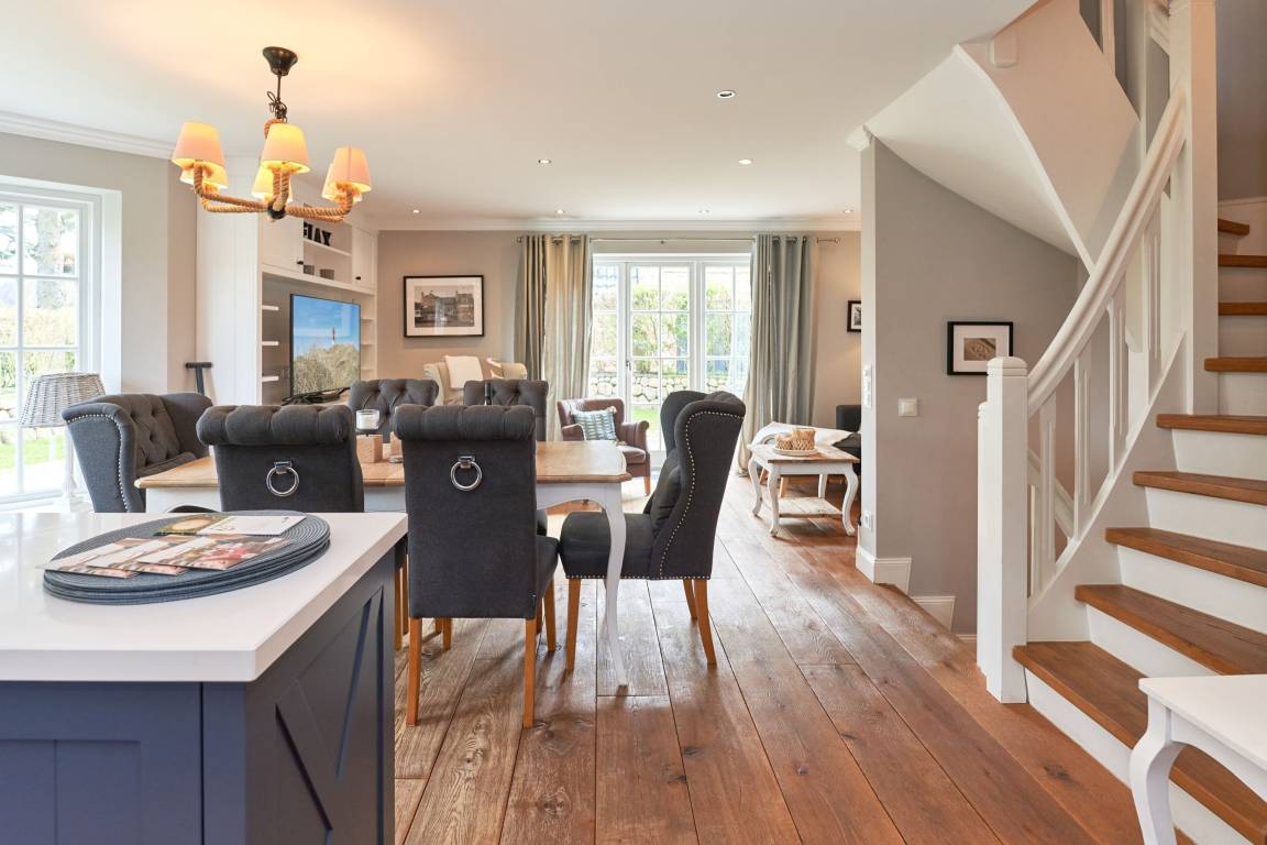 Exklusive Doppelhaushälfte unter Reet im Hampton Style für bis zu 8 Personen. Außen Sylt , innen Hamptons. Über einen kleinen Vorflur mit Garderobe gelangt man in das großzügige Wohnzimmer mit seiner offenen Küche mit den angrenzenden Essplatz für gemütliche Abende. Auffällig und besonders neben der hochwertigen Ausstattung ist das Beleuchtungskonzept sowie die Holzeinbauten mit IPhone - Ladestationen. Im Obergeschoss verfügt über zwei Schlafzimmer und ein Badezimmer mit bodengleicher Dusche. Der ausgebaute Spitzboden verfügt über zwei weitere Einzelbetten. Im Untergeschoss befindet ein Schlafzimmer mit Doppelbett und Schrankeinbauten sowie ein weiteres Wohn und Schlafzimmer. Eine Sauna mit großzügigen Bad ist ebenfalls vorhanden. Der Technik und Hauswirtschafsraum verfügt über eine Waschmaschine und Trockner.