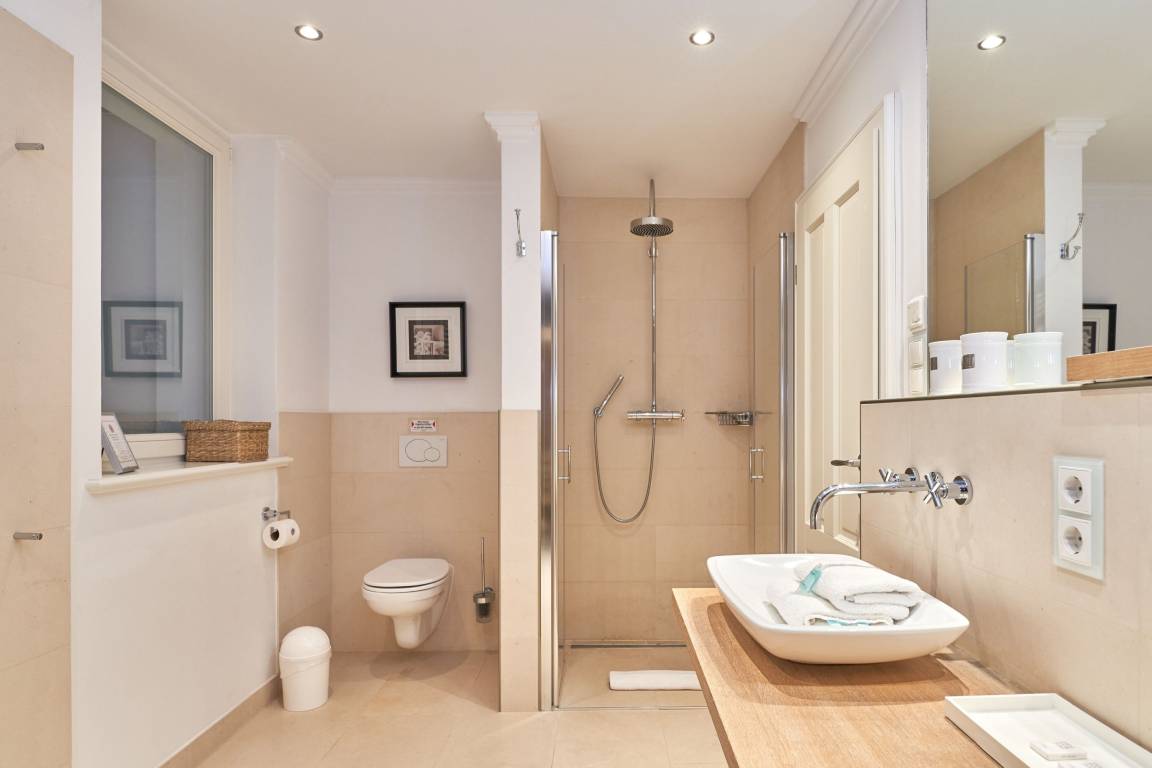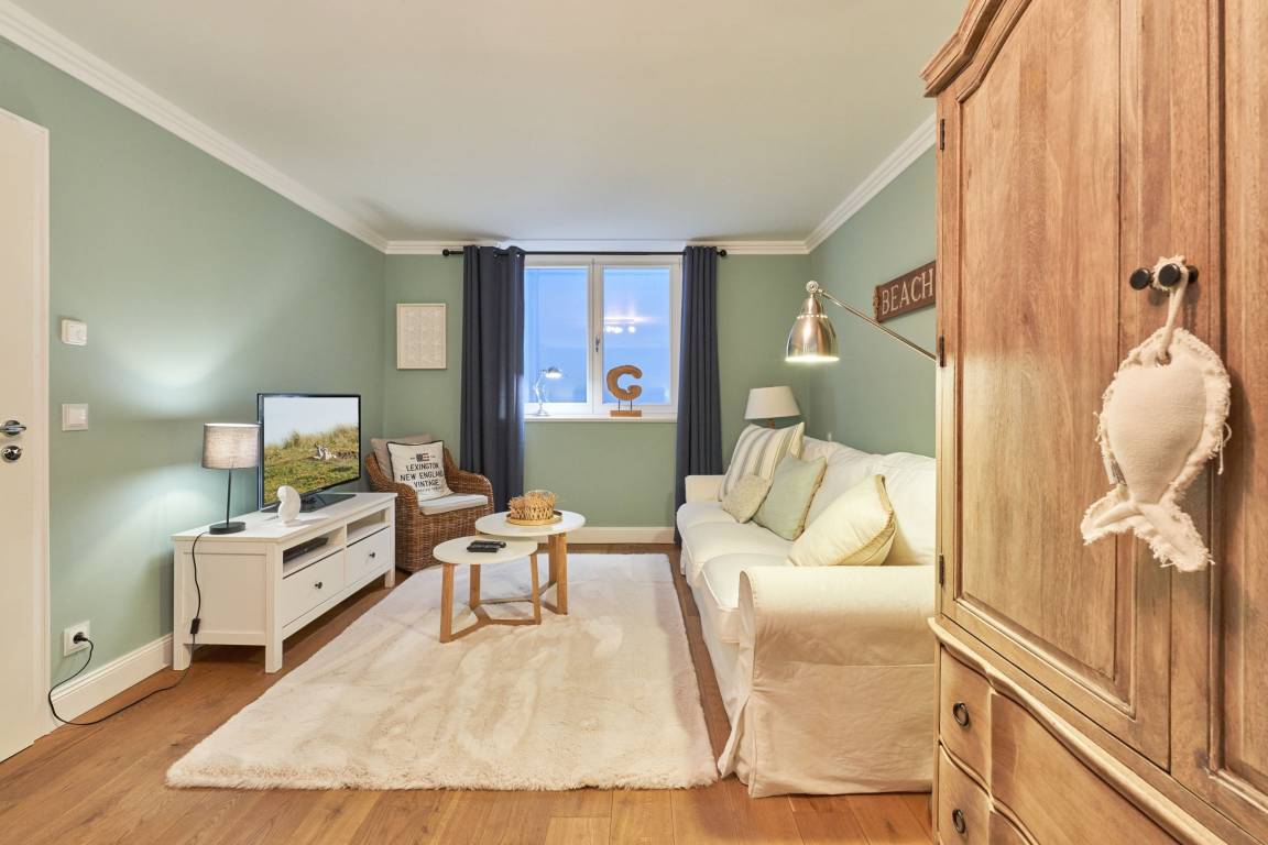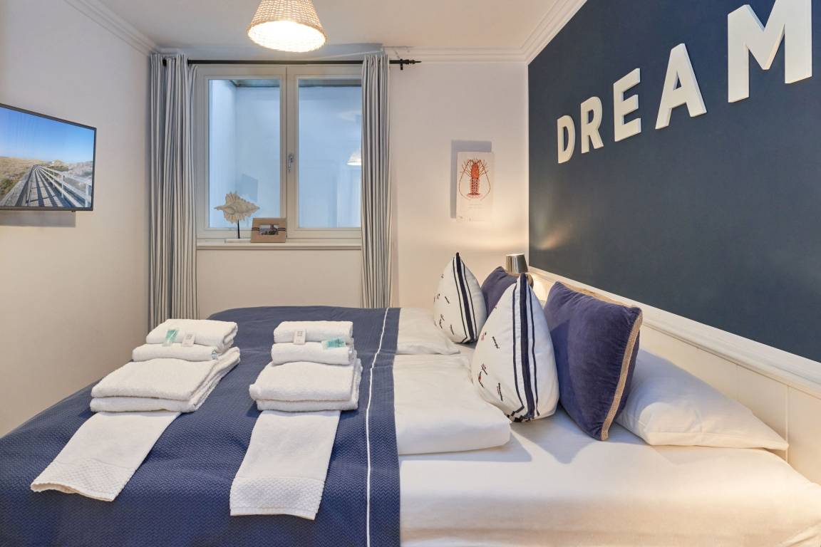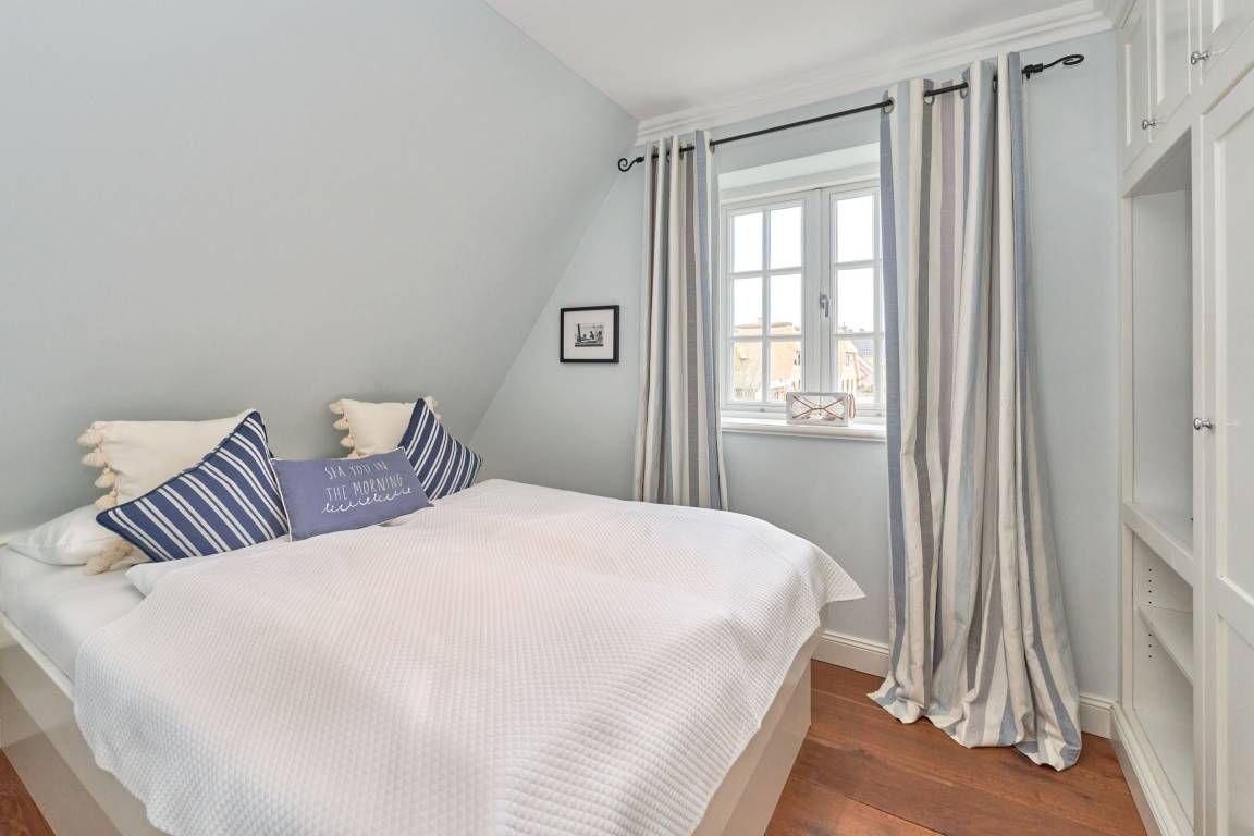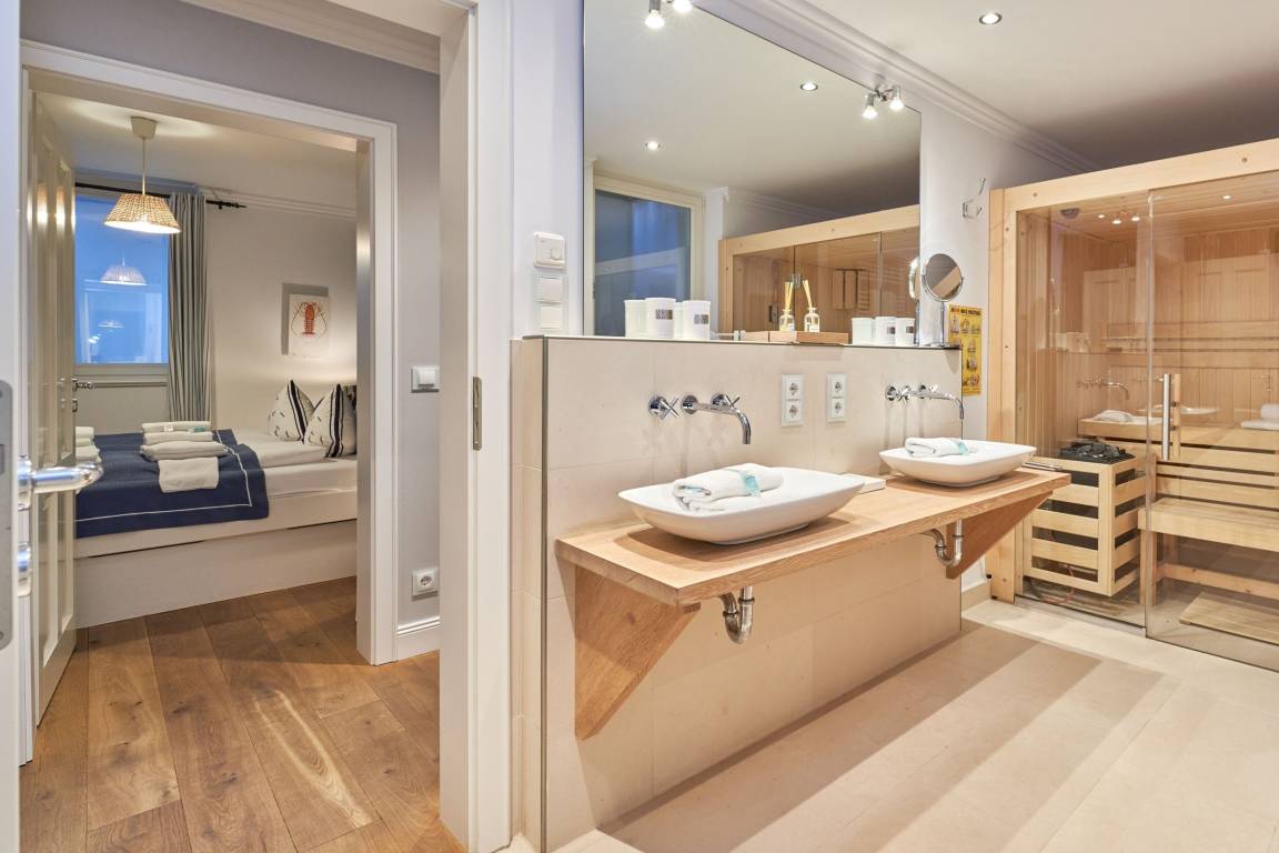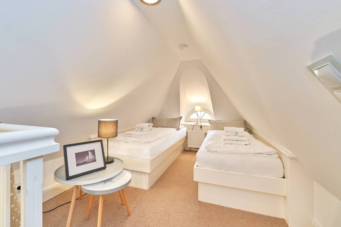 Exklusive Doppelhaushälfte unter Reet im Hampton Style für bis zu 8 Personen. Außen Sylt , innen Hamptons. Über einen kleinen Vorflur mit Garderobe gelangt man in das großzügige Wohnzimmer mit seiner offenen Küche mit den angrenzenden Essplatz für gemütliche Abende. Auffällig und besonders neben der hochwertigen Ausstattung ist das Beleuchtungskonzept sowie die Holzeinbauten mit IPhone - Ladestationen. Im Obergeschoss verfügt über zwei Schlafzimmer und ein Badezimmer mit bodengleicher Dusche. Der ausgebaute Spitzboden verfügt über zwei weitere Einzelbetten. Im Untergeschoss befindet ein Schlafzimmer mit Doppelbett und Schrankeinbauten sowie ein weiteres Wohn und Schlafzimmer. Eine Sauna mit großzügigen Bad ist ebenfalls vorhanden. Der Technik und Hauswirtschafsraum verfügt über eine Waschmaschine und Trockner.
