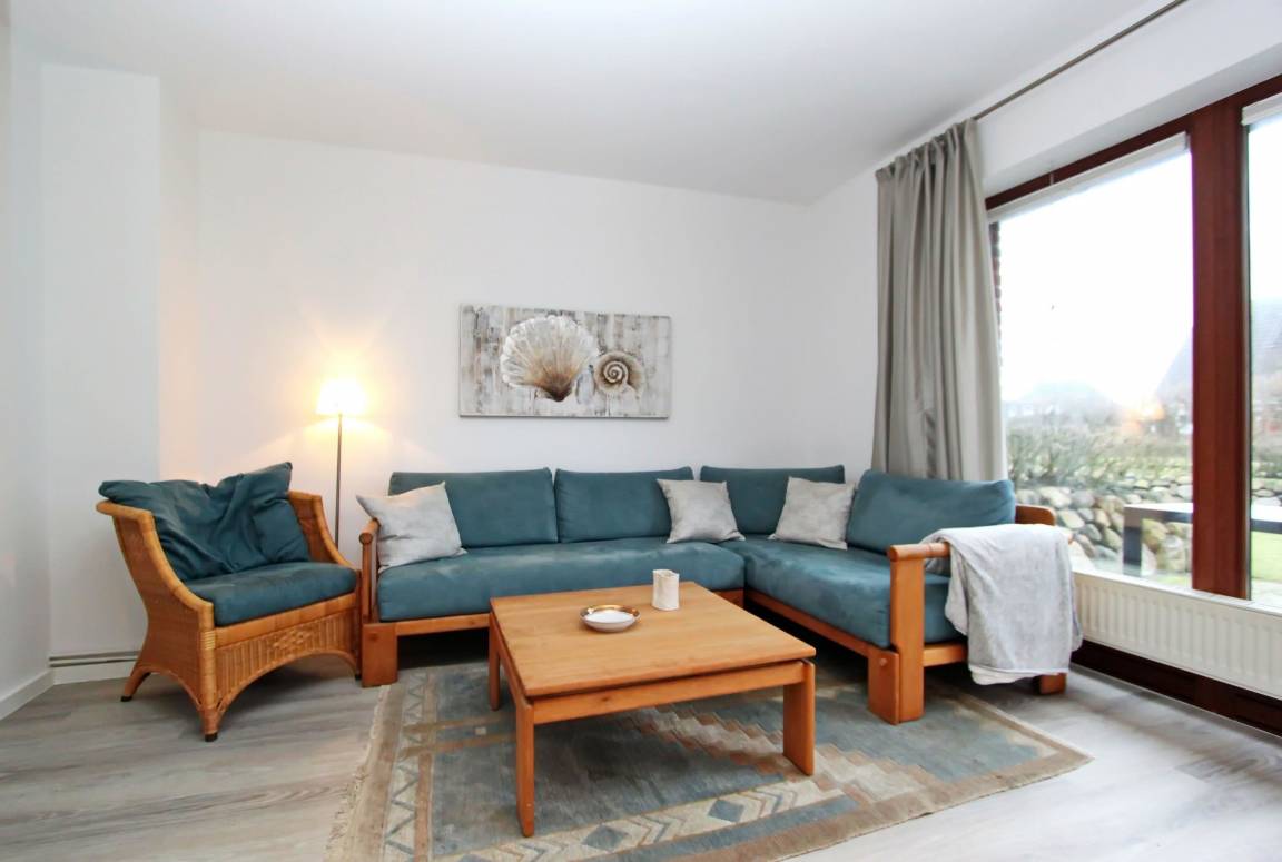 gepflegtes 2 Zi.-App. in ruhiger, zentraler Lage in Wenningstedt. Das Objekt befindet sich auf einer Ebene im EG, ist ca. 45 m² groß und bietet Platz für 2 Personen. Ein Wohn-/Schlafraum mit zwei 2 Sitzer-Couchen (als Bett umklappbar), Tisch, 1 Korbstuhl, Vitrinenschrank und Sideboard, Sat-Flat-TV, kl. Kompaktanlage mit CD-Player, offene Küche mit Ceranherd, Mikrowelle, Kühlschrank mit Gefrierfach und einen Essplatz für 4 Personen. Vom Wohnzimmer haben Sie direkten Zugang zur Westterrasse. Flur mit Garderobe. Schlafzimmer mit zwei Einzelbetten (zusammengeschoben), Nachtschränke sowie ein großer Kleiderschrank, der ausreichend Stauraum bietet. Duschbad/WC. Zum Appartement gehört der Stellplatz 3.