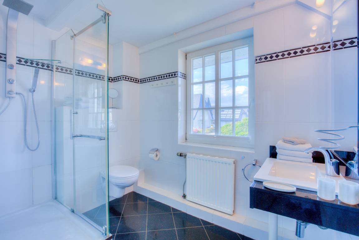 Richtig relaxen kann man im Wohlfühlbad mit Whirlpool oder im unteren großen Duschbad..