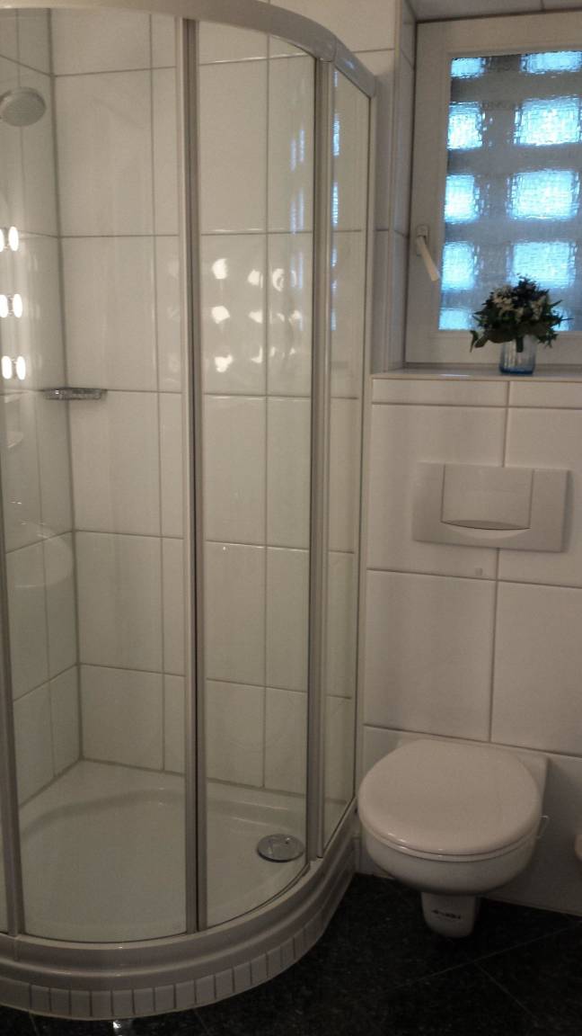Der Vorhang ermöglich eine Verdunkelung. Im angrenzenden Badezimmer mit Fenster gibt es eine Dusche und eine Toilette.