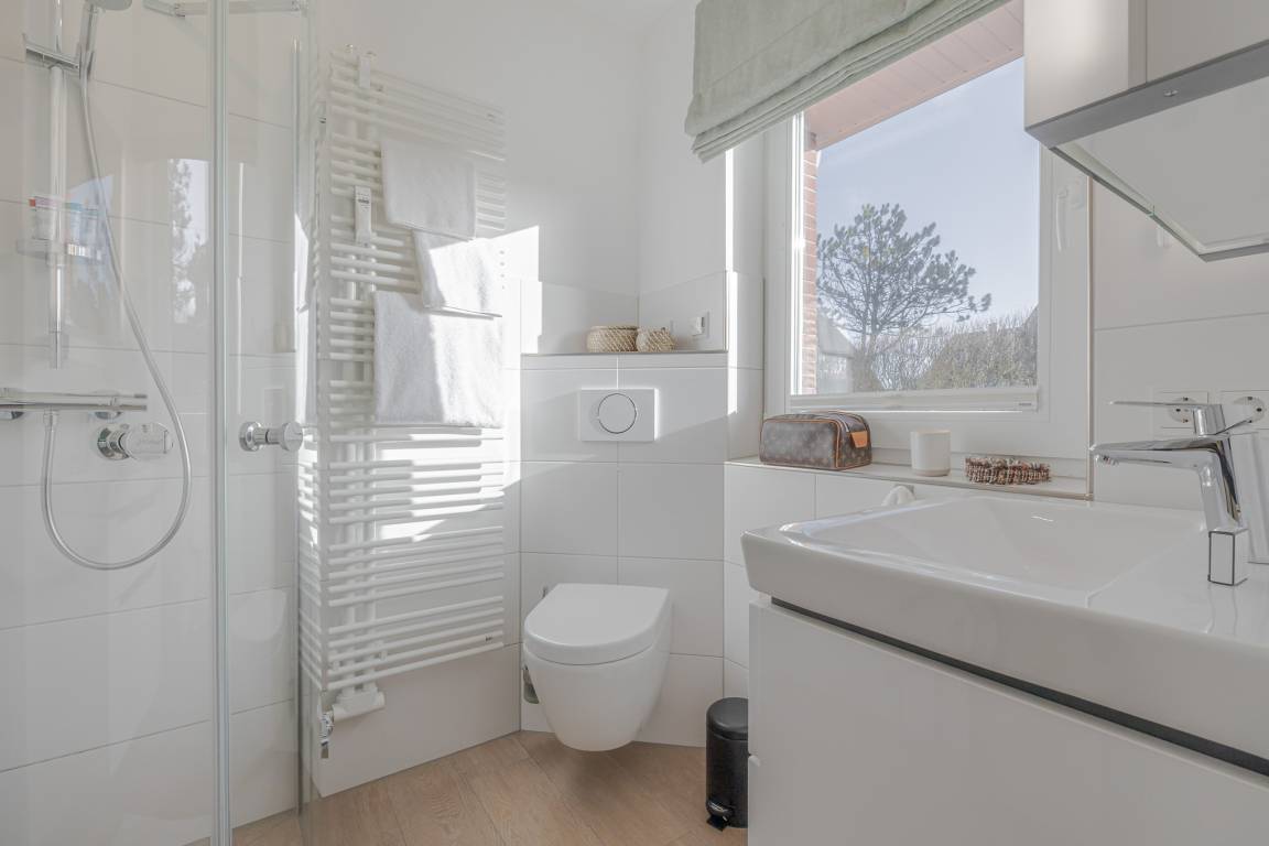 Draußen erwartet Sie Ihre eigene Terrasse mit Gartenteil und Strandkorb (Mai–Oktober). Hier lassen Sie den Tag mit einem Glas Wein ausklingen oder starten morgens mit Sonnenfrühstück – bei guter Sicht sogar mit kleinem Meerblick.