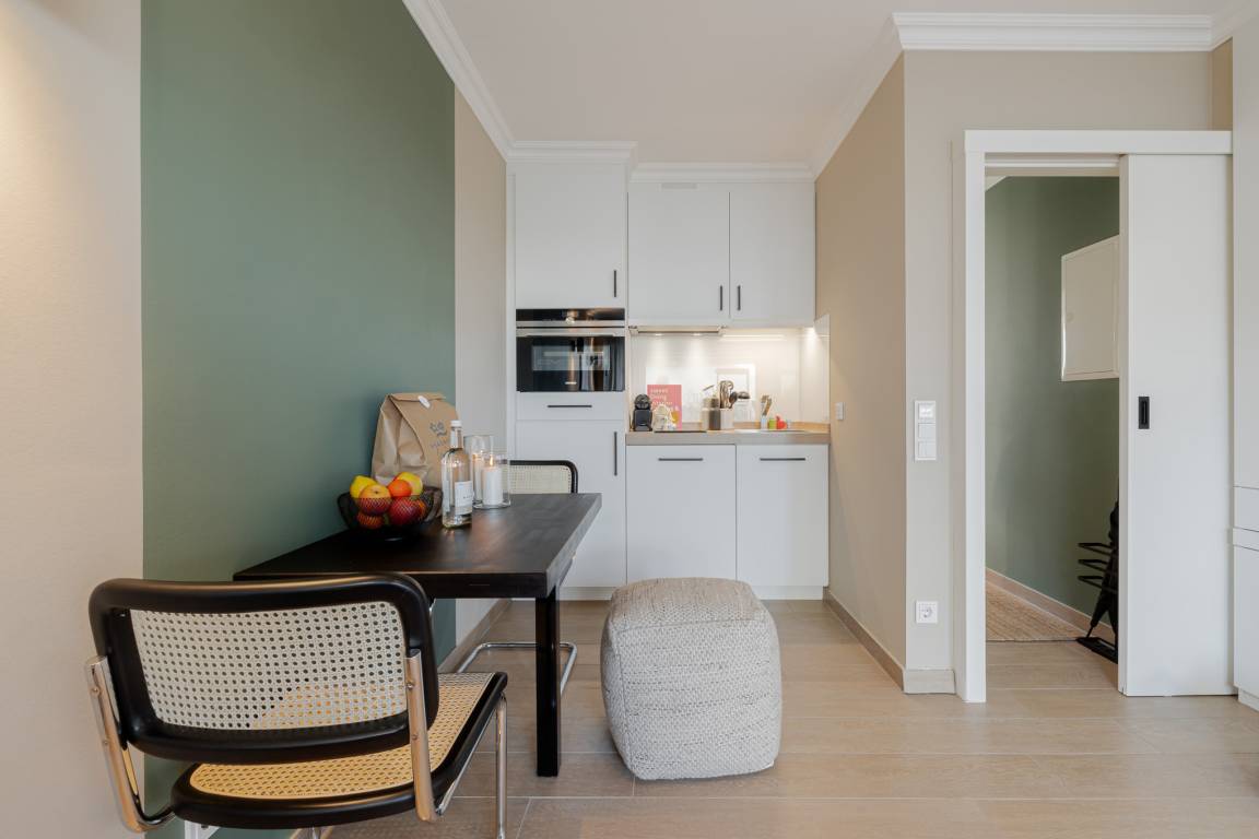 Die Küche ist clever integriert und voll ausgestattet: Siemens-Markengeräte, Induktionskochfeld, großer Geschirrspüler, tiefes Edelstahlbecken und ein Backofen in Griffhöhe mit praktischer Vorwärmfunktion für Geschirr machen auch das Kochen im Urlaub zum Vergnügen.