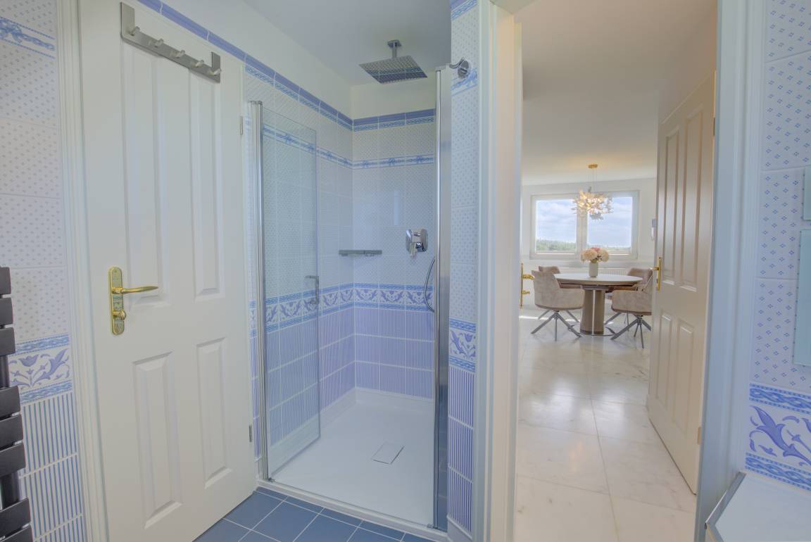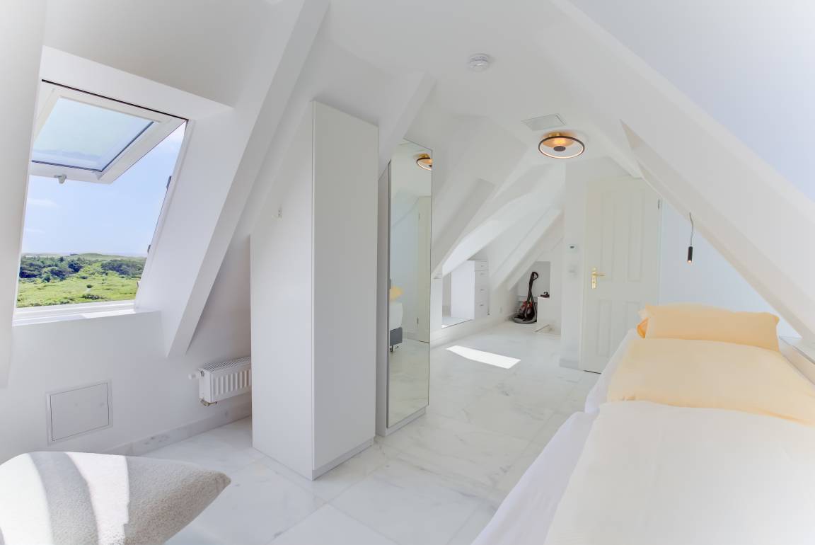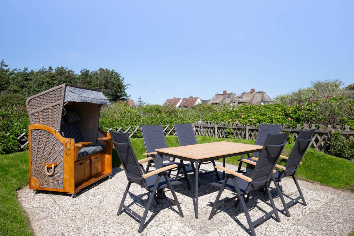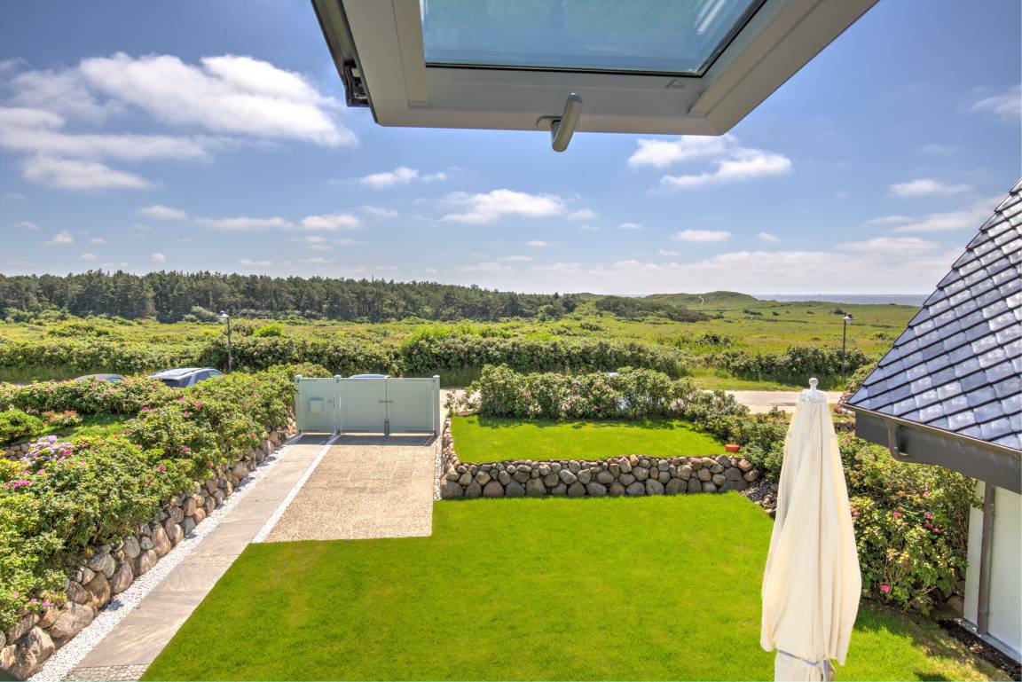 Diese exklusive über 2 Ebenen reichende 80m² Ferienwohnung verzaubert mit einem nach Süden ausgerichteten 25m² großen Wohnzimmer mit einem wunderschönen Ausblick über die weitläufige Heidelandschaft, 2 Schlafzimmern, 2 Bädern und einer großen Wohnküche. Im Obergeschoss erwartet Sie der lichtdurchflutete, großzügige Wohn-/Essbereich mit tollem Ausblick. Eine voll ausgestattete Einbauküche mit Markengeräten sowie ein behagliches Doppelschlafzimmer mit einem Boxspringbett für 2 Personen, Einbauschränken sowie ein Duschbad befinden sich ebenfalls auf dieser Ebene. In dem darüber liegenden Dachgeschoss befindet sich ein weiteres Schlafzimmer mit zwei einzelnen Boxspringbetten und einem tollen Ausblick über das Meer und die Heide. Auch dieses Schlafzimmer verfügt über ein eigenes Duschbad. Dieser im Obergeschoss gelegenen Ferienwohnung ist auf der großen Gartenwiese eine eigene Terrasse mit Strandkorb und Gartenmöbeln zugeordnet.