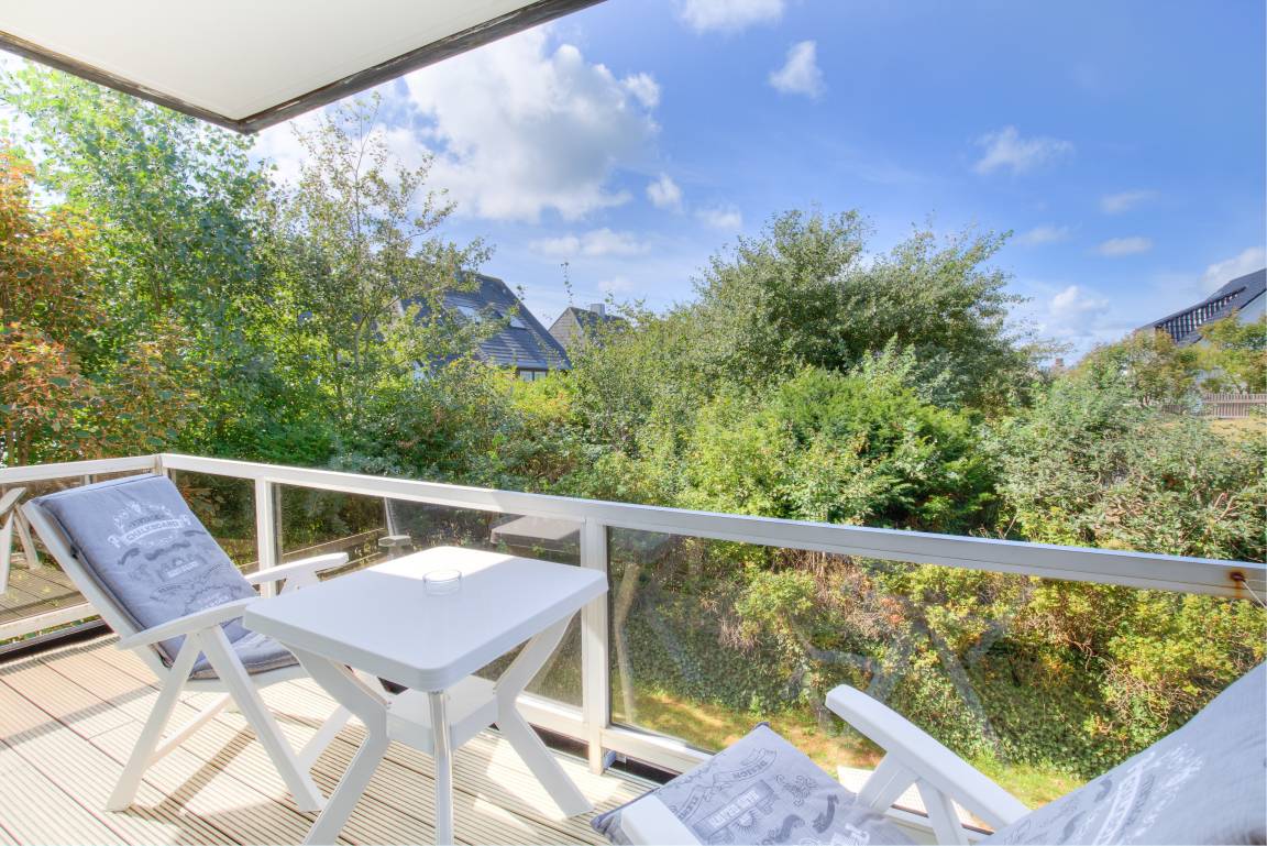 Vom Essplatz schauen Sie direkt auf den großen West-Balkon mit Gartenmöbeln.