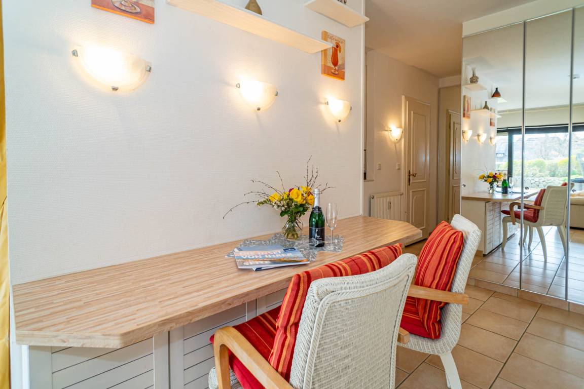 Die offene Küche hat einen Geschirrspüler, ein Ceranfeld mit zwei Kochfeldern und einen Kühlschrank. Kaffeemaschine, Wasserkocher und Toaster gehören zur Grundausstattung,