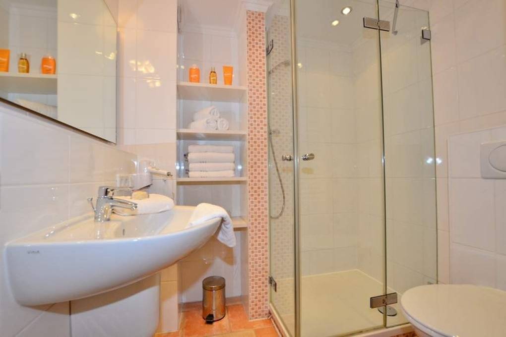 Im Bad befinden sich eine Dusche, ein WC und ein Waschtisch.