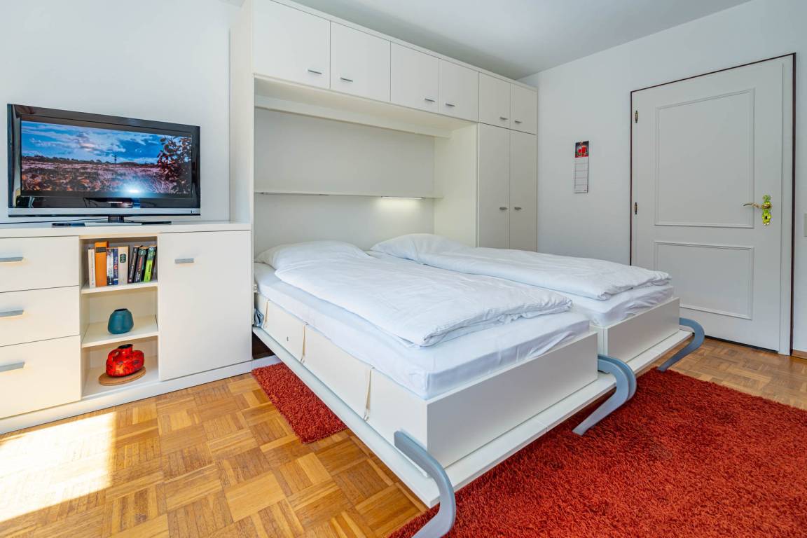Vom Vorflur mit Garderobe erreichen Sie den hellen, kombinierten Wohn- und Schlafraum, das separate Duschbad sowie die freundliche, gut ausgestattete Küche mit Fenster. Der Wohn-/Schlafbereich ist mit echtem Parkettboden, einem bequemen Zweisitzer-Sofa, einem Sessel mit Fußhocker sowie zwei einzeln ausklappbaren Doppelschrankbetten eingerichtet. Für Unterhaltung sorgen ein Kabel-Flachbild-TV, WLAN (ohne Gewähr) und eine Radio-/CD-Anlage.