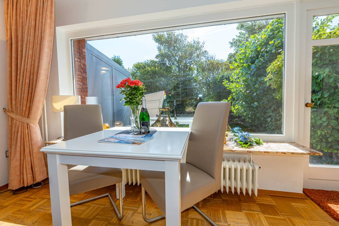 Die nach Süden ausgerichtete Terrasse mit eigenem kleinen Gartenanteil lädt mit Balkonmöbeln, Auflagen und einem Strandkorb zum Sonnenbaden, Frühstücken im Freien oder einfach zum Entspannen ein.