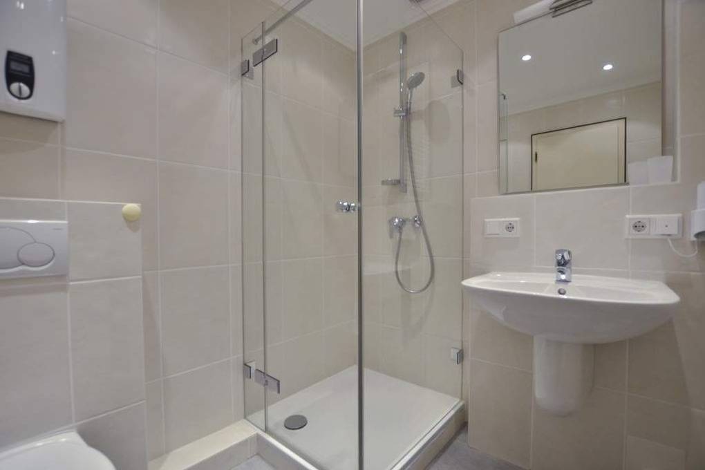 Das moderne Duschbad verfügt über eine ebenerdige Dusche, einen Handtuchtrockner sowie einen festinstallierten Fön – hell, funktional und stilvoll gestaltet.