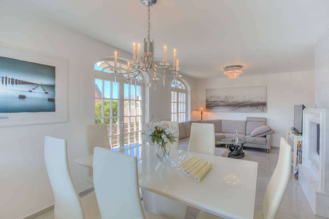 Im Erdgeschoss empfängt Sie ein großes Wohnzimmer mit großer Eckgarnitur, schöner Kamin, Essplatz und komplette Küche mit Backofen, Mikrowelle und Geschirrspüler.