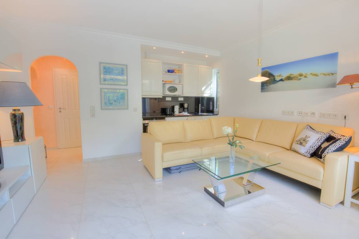 Über den Vorflur gelangen Sie in das schöne, lichtdurchflutete Wohnzimmer mit hochwertiger Polstergarnitur und bequemen Schrankwandbett.