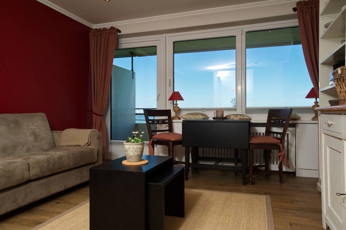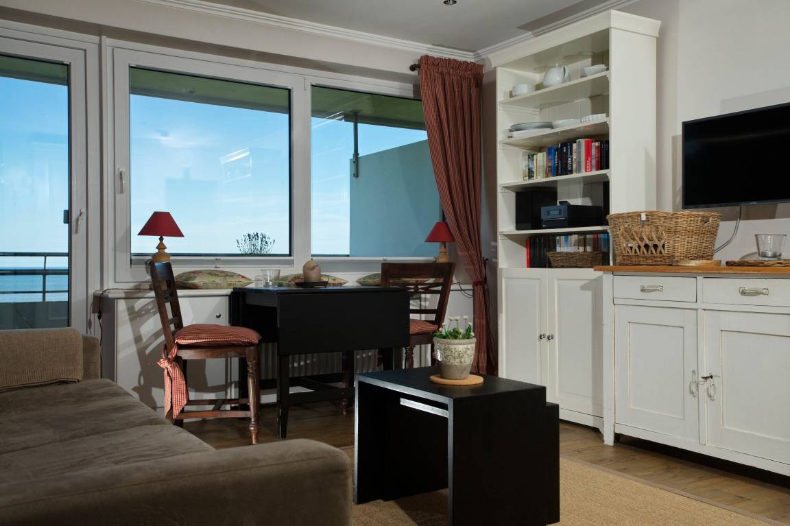 Im Wohnzimmer gibt es ein komfortables Schlafsofa mit hochwertigem Lattenrost und einen ausziehbaren Esstisch mit 2 Stühlen, direkt am Fenster mit Meerblick.