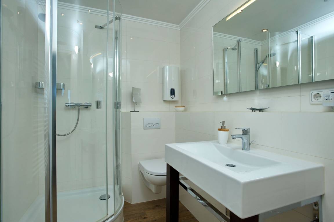 Das moderne Badezimmer verfügt über eine Halbrunddusche, einen beheizbaren Handtuchhalter, einen Design-Badezimmerschrank, sowie ein "Tivoli-Radio". Duschen mit Blick auf die Nordsee.