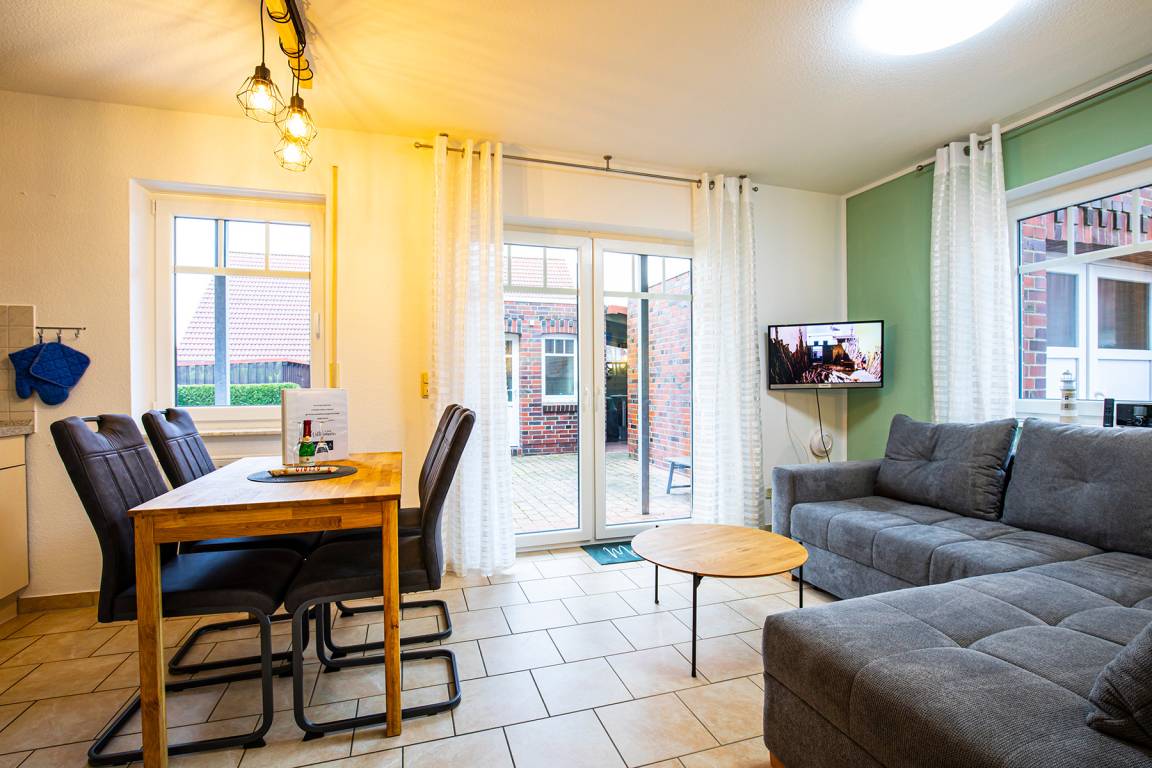 Unsere Ferienwohnung 4 garantiert Ihnen mit einer Fläche von 58 m² und einer großen Terrasse eine erholsame Urlaubszeit in Ostfriesland. Wohnen Sie parterre und entspannen Sie sich in Ihrem Zuhause auf Zeit mit einer grandiosen Fernsicht über das idyllische Marschland.