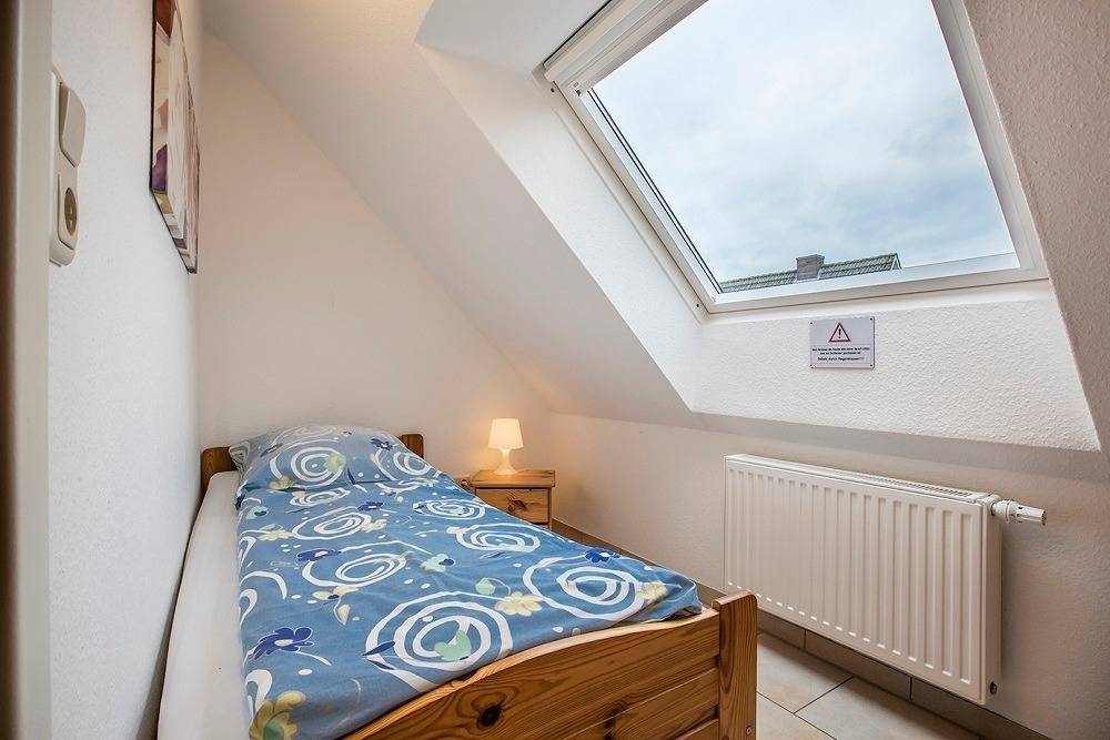 Drei weitere Schlafmöglichkeiten erwarten Sie im 2. Obergeschoss. Hier stehen 3 jeweils 2 Meter lange Einzelbetten und ein Kleiderschrank.