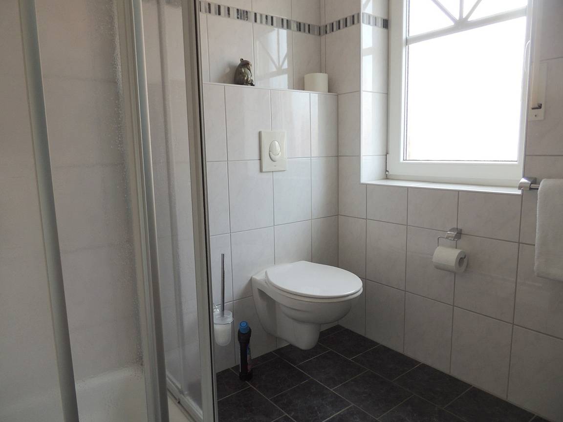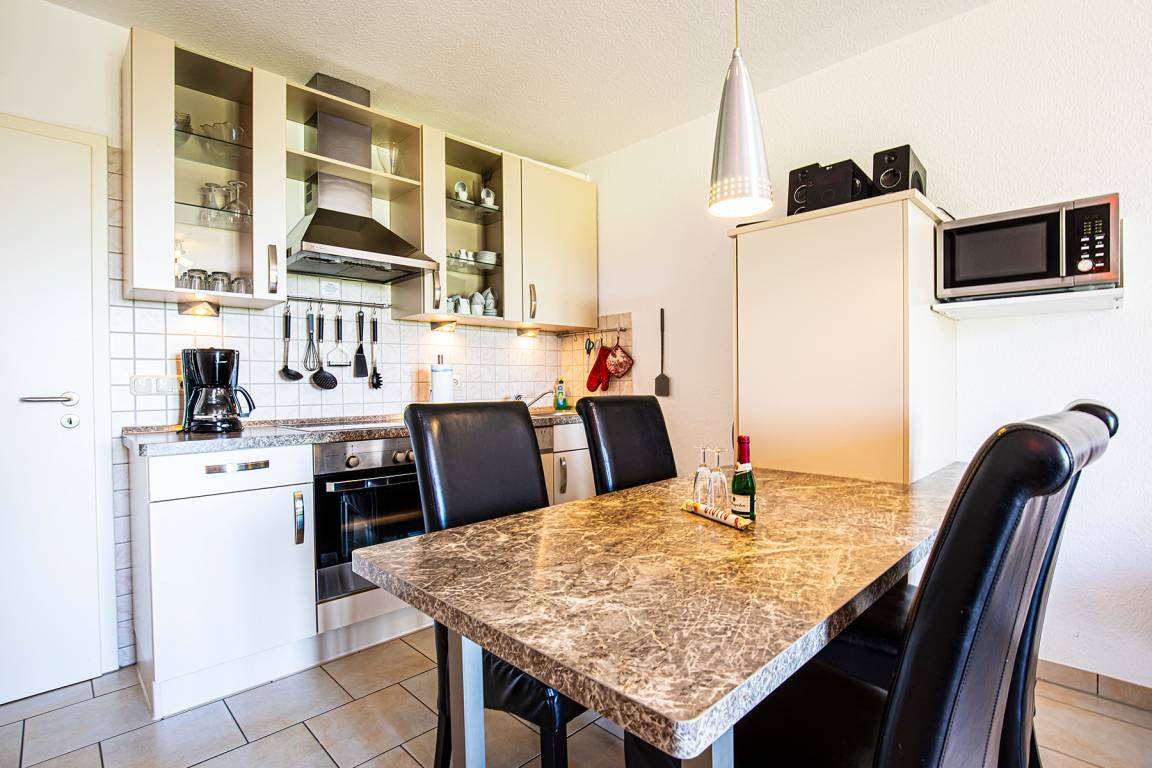 Ein großzügiger Wohn-Essbereich mit offener Küche bietet im Erdgeschoss angenehm Platz für alle Gäste. Angrenzend befindet sich eines von insgesamt zwei Badezimmern mit Dusche. Ein großes Schlafzimmer mit Doppelbett und französischem Balkon, ein zweites angrenzendes Bad mit Dusche sowie ein weiteres kleines Schlafzimmer für eine Person befindet sich in der ersten Etage.
