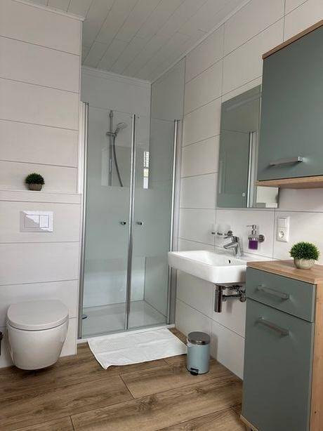 Im Badezimmer befinden sich Dusche, Waschbecken und WC, sowie Handtücher und ein Föhn.