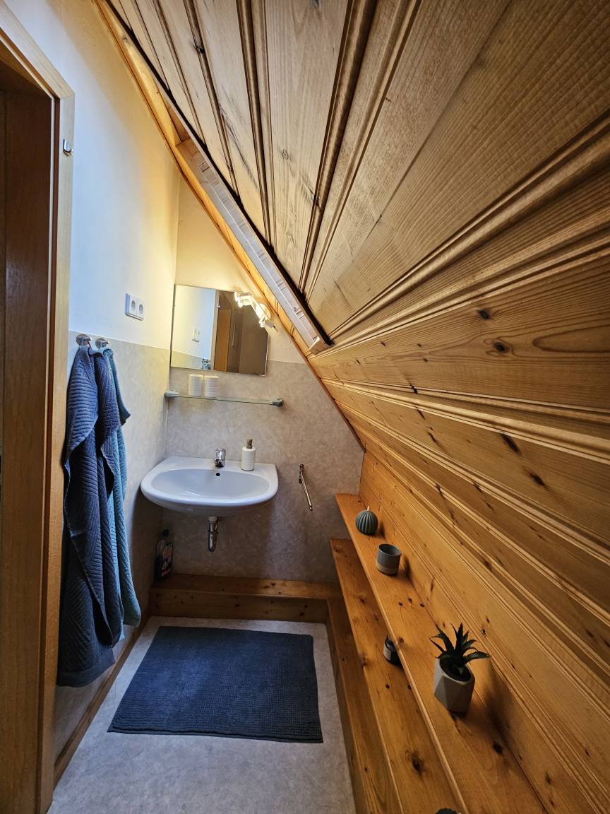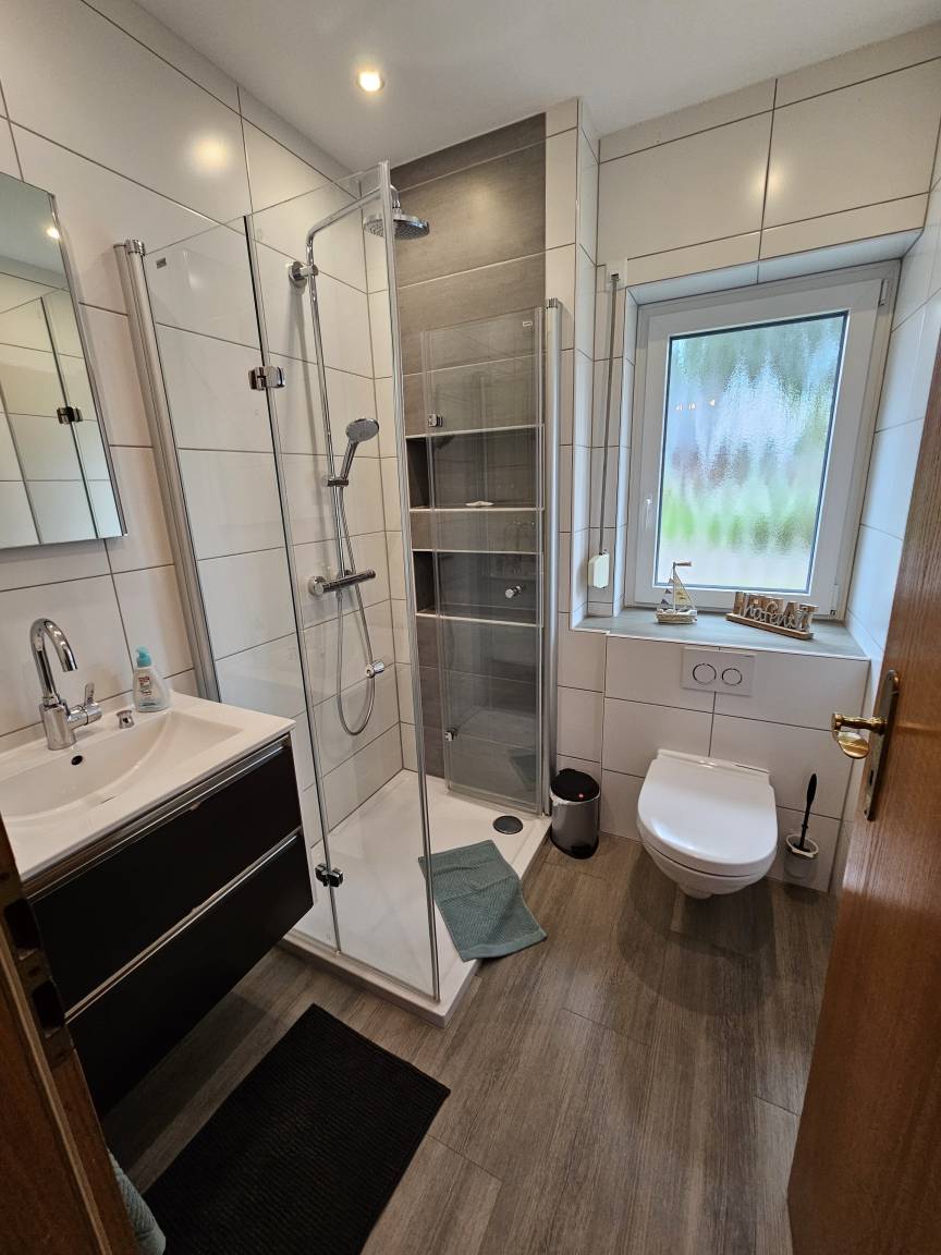 Ein Schlafzimmer sowie ein Badezimmer mit Dusche und WC liegen ebenfalls im Erdgeschoss. Im Obergeschoss erwarten Sie zwei weitere Schlafzimmer und eine zusätzliche Toilette.