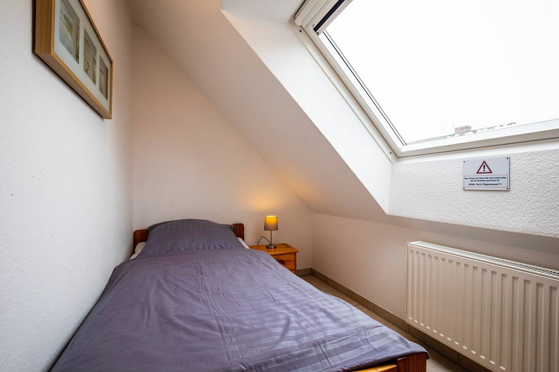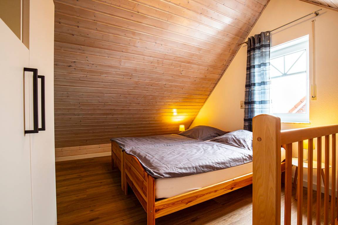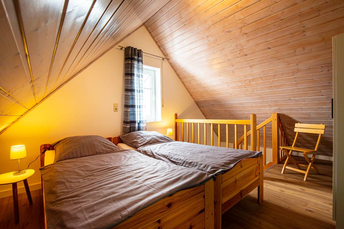 Zwei weitere Schlafmöglichkeiten erwarten Sie im 2. Obergeschoss. Hier stehen 2 jeweils 2 Meter lange Einzelbetten und ein Kleiderschrank.