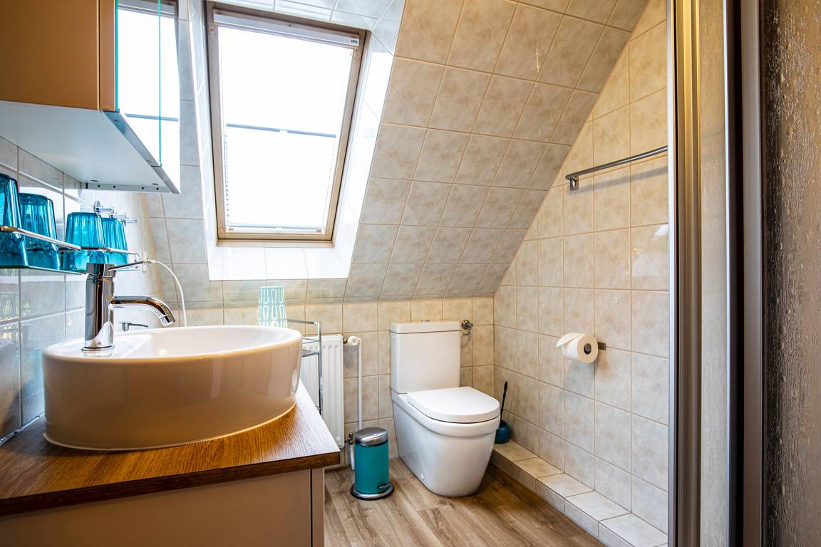 Angrenzend befindet sich ein kleiner Abstellraum. Über eine massive Treppe gelangen Sie in das Dachgeschoss wo sich zwei große Schlafzimmer mit jeweils einem Doppelbett und Kleiderschrank befinden, sowie das angrenzende Duschbad.