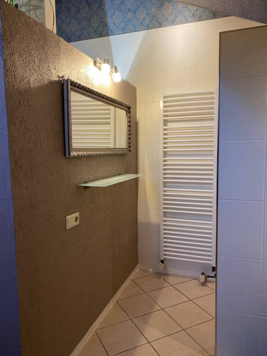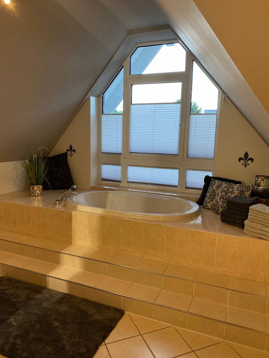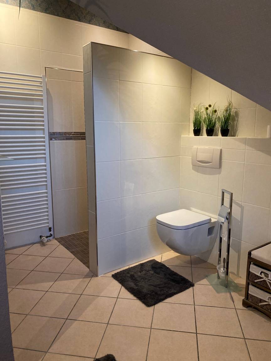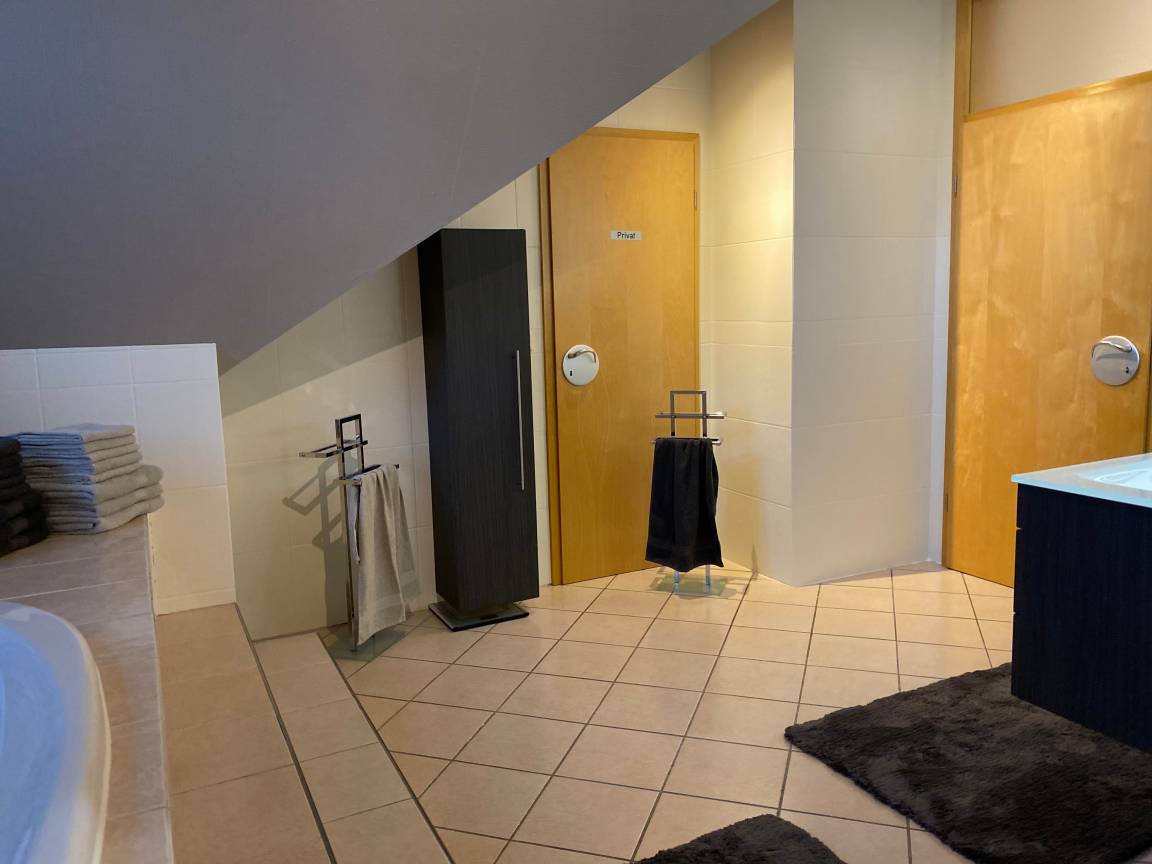 Es gibt insgesamt 3 Schlafräume. Im Obergeschoß gibt es ein großen Bad mit Dusche und großer Badewanne.