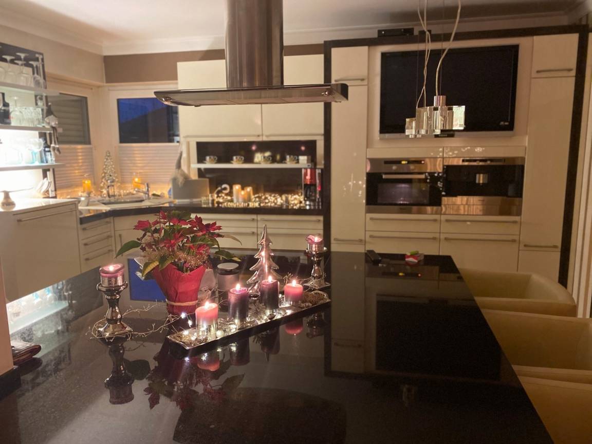 Der offene Wohn und Essbereich ist mit einer modernen Küche(Kühlschrank mit separatem Gefrierschrank, E-Herd mit Ceranfeld, Backofen, Geschirrspüler, Wasserkocher, Kaffeeautomat, TV, Toaster sowie allen weiteren täglich benötigten Gegenstände) ausgestattet.