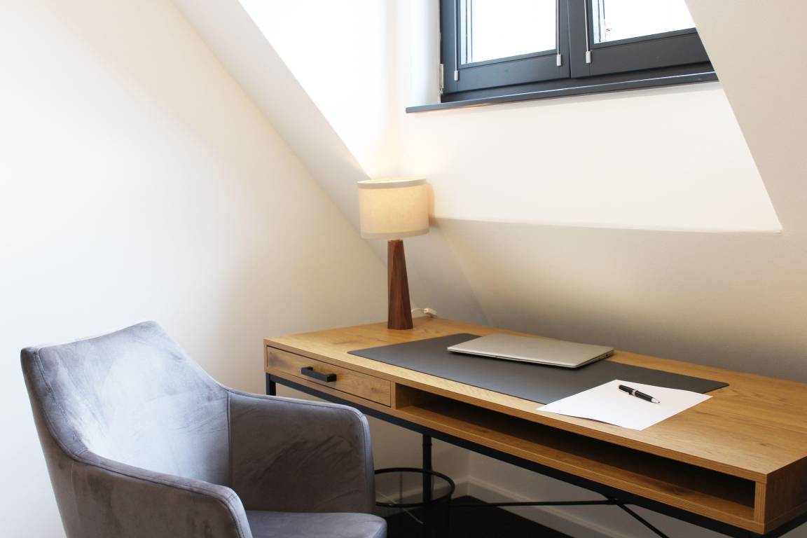 In der Galerie, über eine Treppe vom Wohnzimmer erreichbar, befindet sich das zweite, großzügige King-Size-Bett (180x200 cm) mit vier großen Schubladen für Kleidung sowie ein Arbeitsbereich mit Schreibtisch. Ein Blick auf das Schloss von Wernigerode unterstreicht die besondere Atmosphäre des Schlafbereichs.