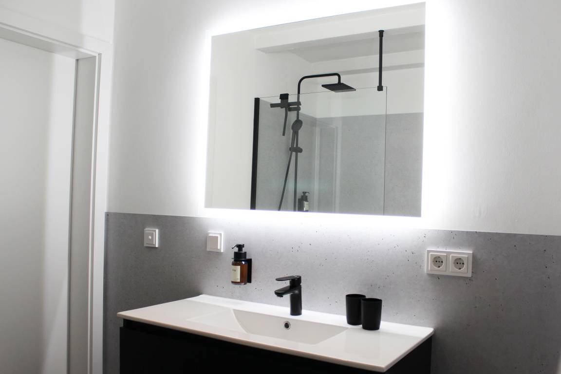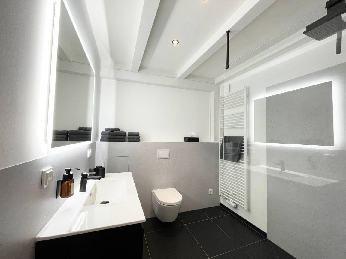 Das modern gestaltete Bad ist mit Fußbodenheizung und einer großen, bodengleichen Regendusche ausgestattet. Ein Handtuchwärmer sorgt auch im Sommer für stets trockene Handtücher, während der großzügige, beleuchtete Spiegel ausreichend Helligkeit für die tägliche Pflege bietet. Ein Föhn und reichlich Ablagefläche für Kosmetika runden den Komfort ab.